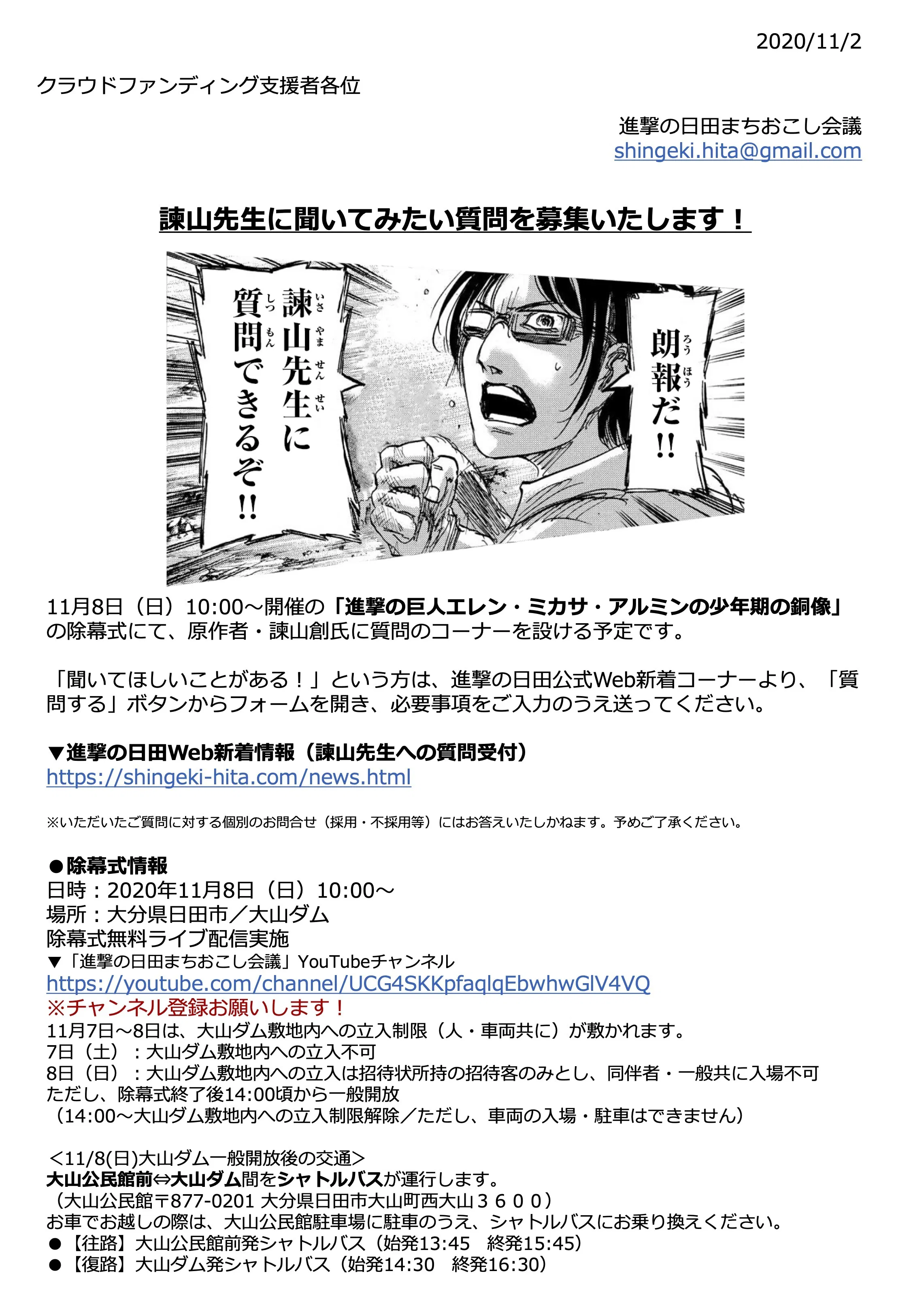 ▼進撃の日田Web新着情報(諫山先生への質問受付)