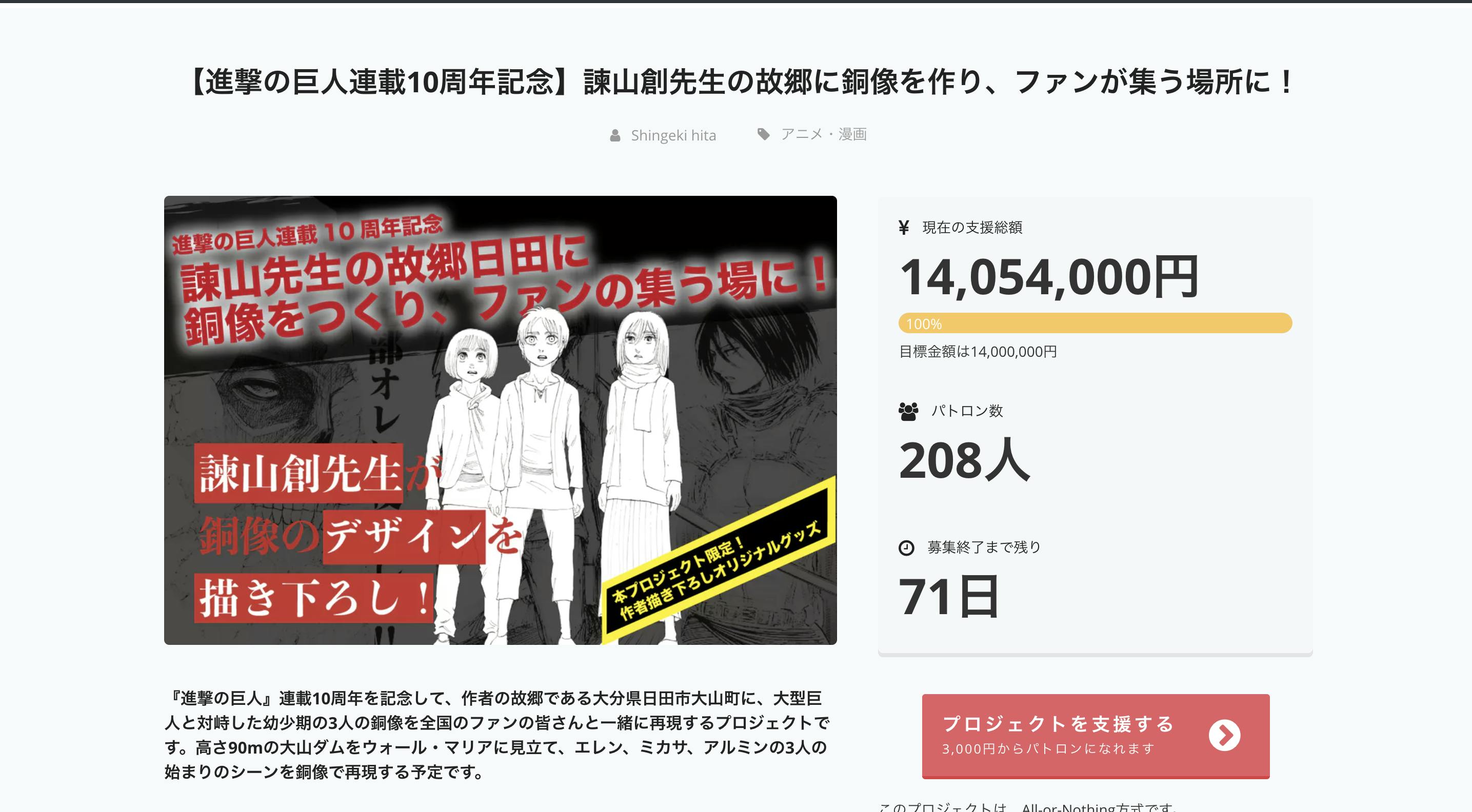 皆様のご支援のおかげで、進撃の巨人連載10周年を記念したプロジェクト「諫山先生の故郷日田に銅像をつくり、ファンの集う場に!」の目標金額1400万円を達成することができました!!