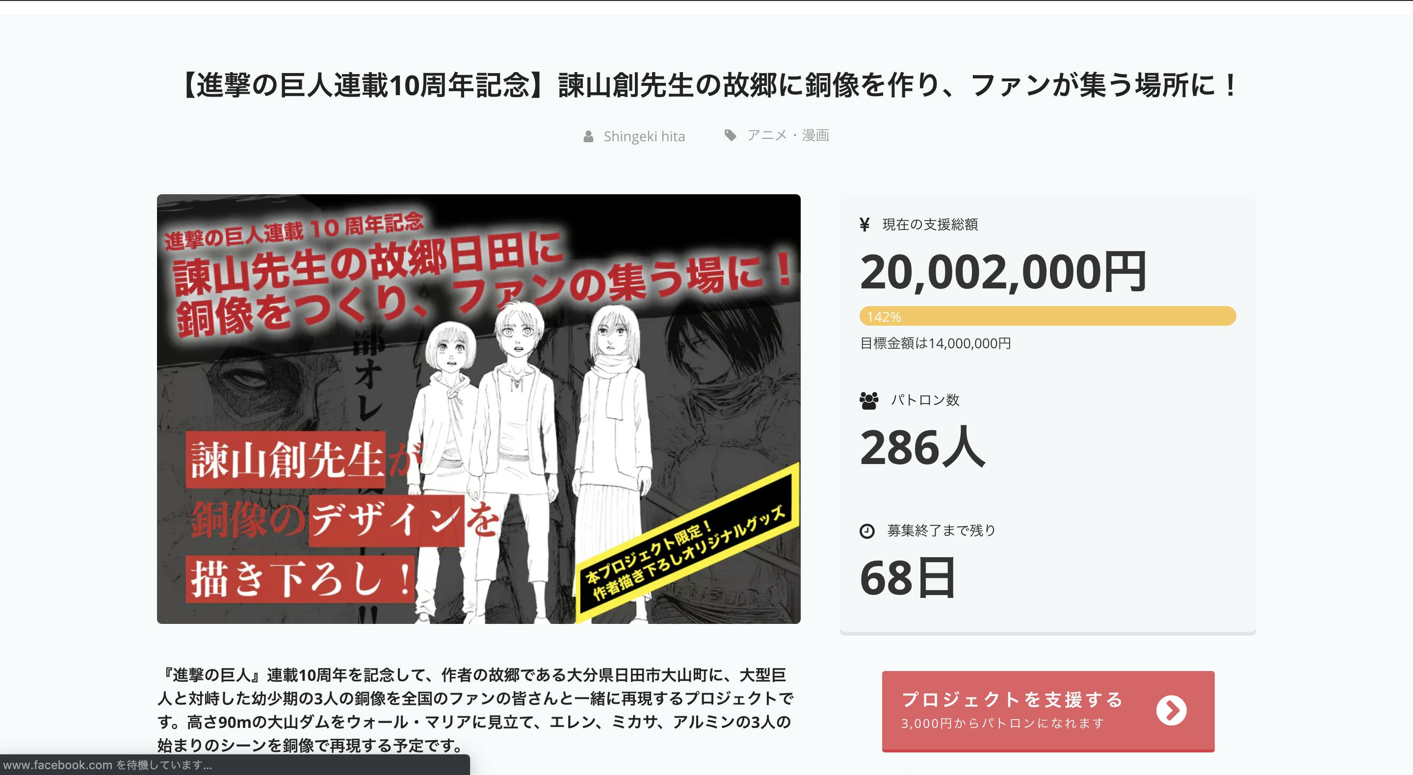 皆様のご支援のおかげで、進撃の巨人連載10周年を記念したプロジェクト「諫山先生の故郷日田に銅像をつくり、ファンの集う場に!」の目標金額をさらに上回り、支援金額2000万円まで到達しました!!