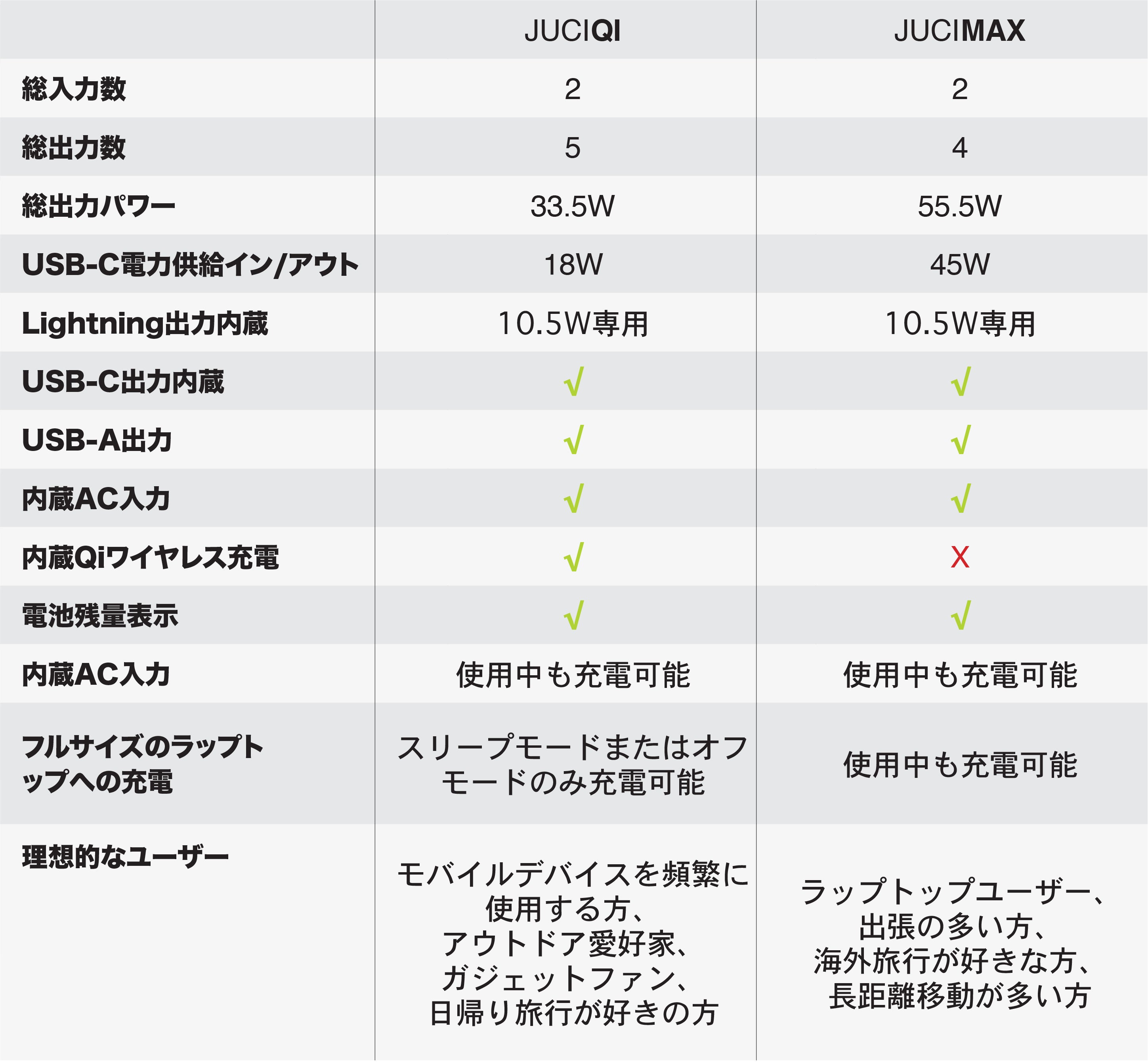 JUCI QiとJUCI Maxはいずれも下記デバイスで使用できます。ワイヤレス充電対応のスマートフォン、タブレット(iPadを含む)、ラップトップ、ポータブルゲーム機(ニンテンドースイッチを含む)、ヘッドフォン(AirPodを含む)、ポータブルスピーカー、ウェアラブル(Apple Watchを含む)、デジタルカメラなど