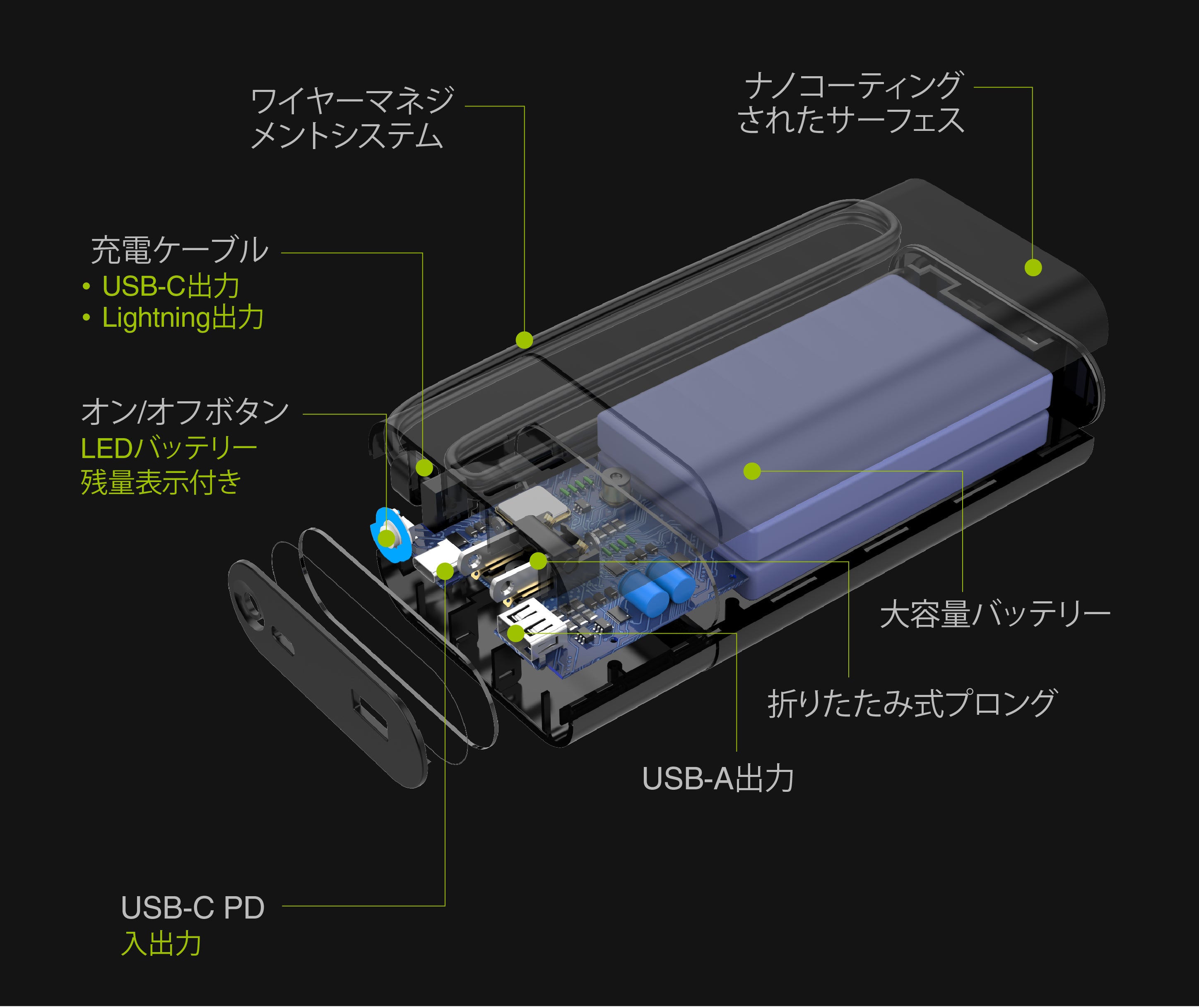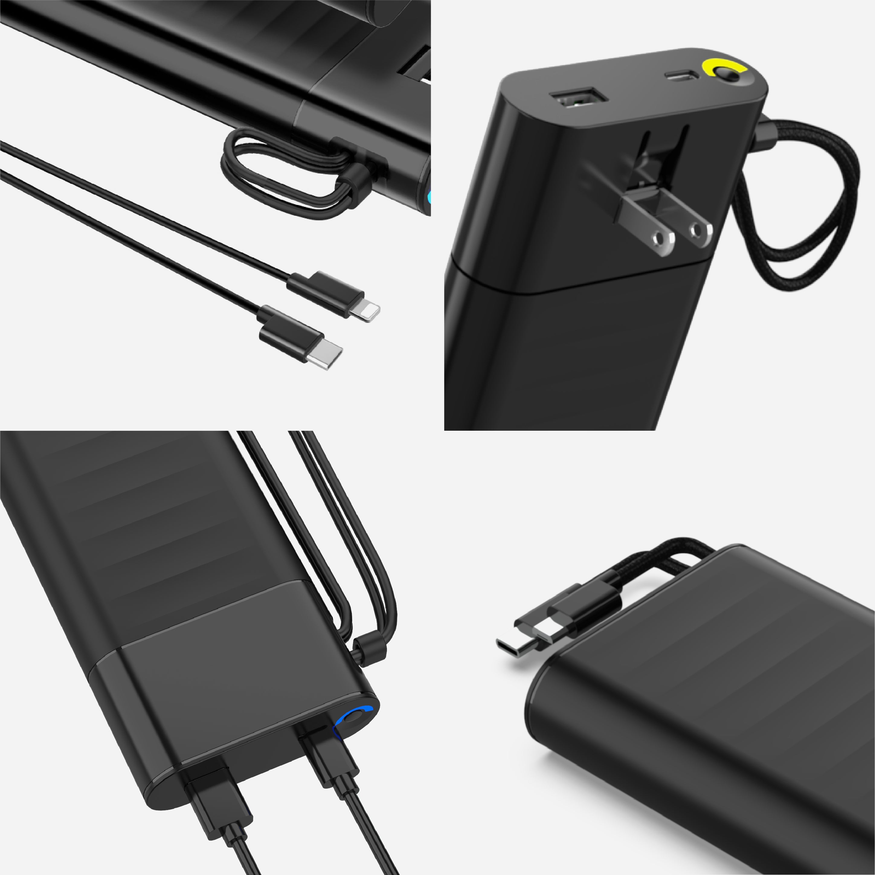 内臓ACプラグ | Qiワイヤレス充電| 18000mAhバッテリー|Lightning | USB-C | PD |急速充電