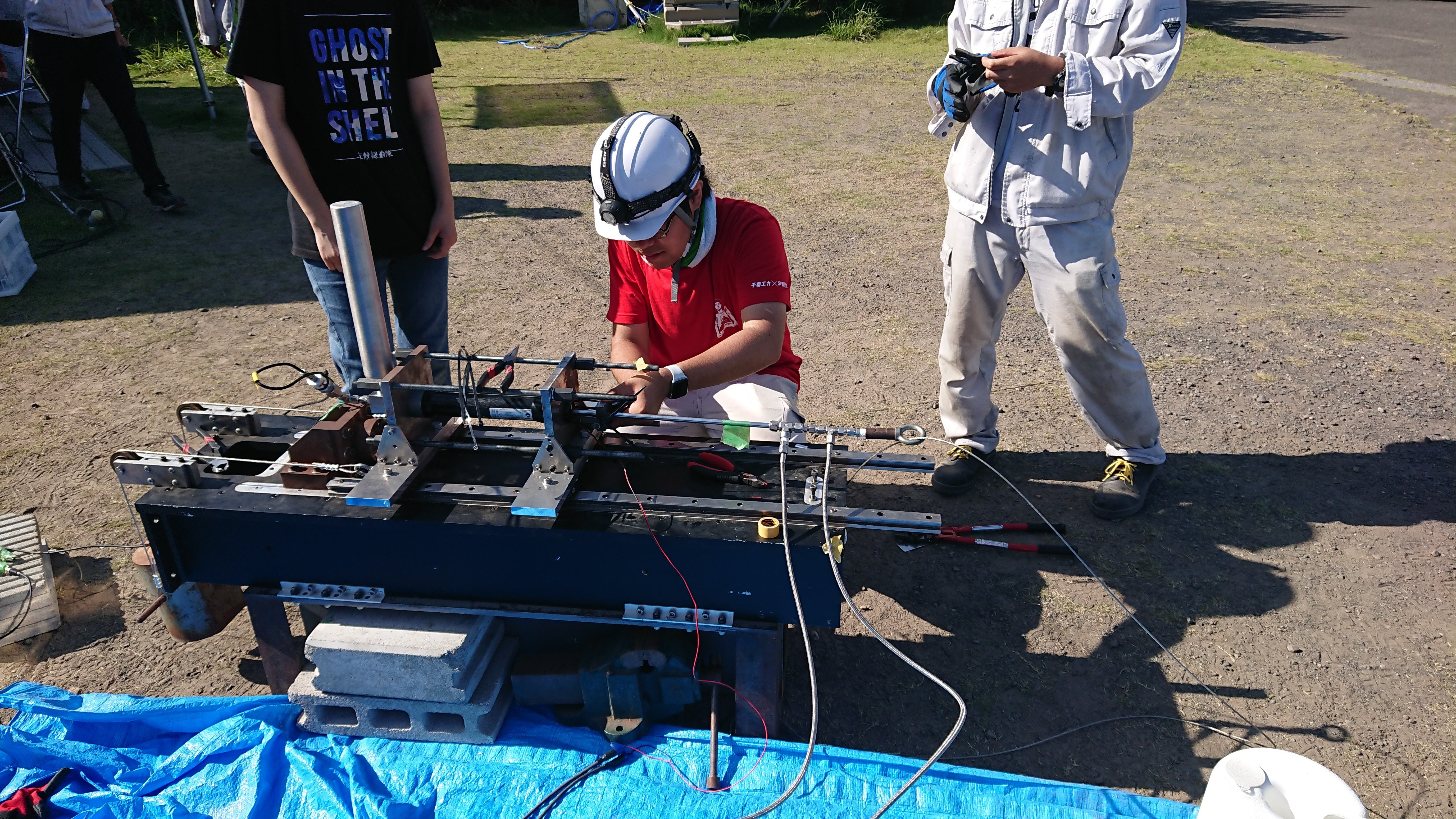 今日はイベント当日に打ち上げるロケットエンジンの燃焼実験です。エンジンを燃焼架台と呼ばれる台に横向きに設置します。