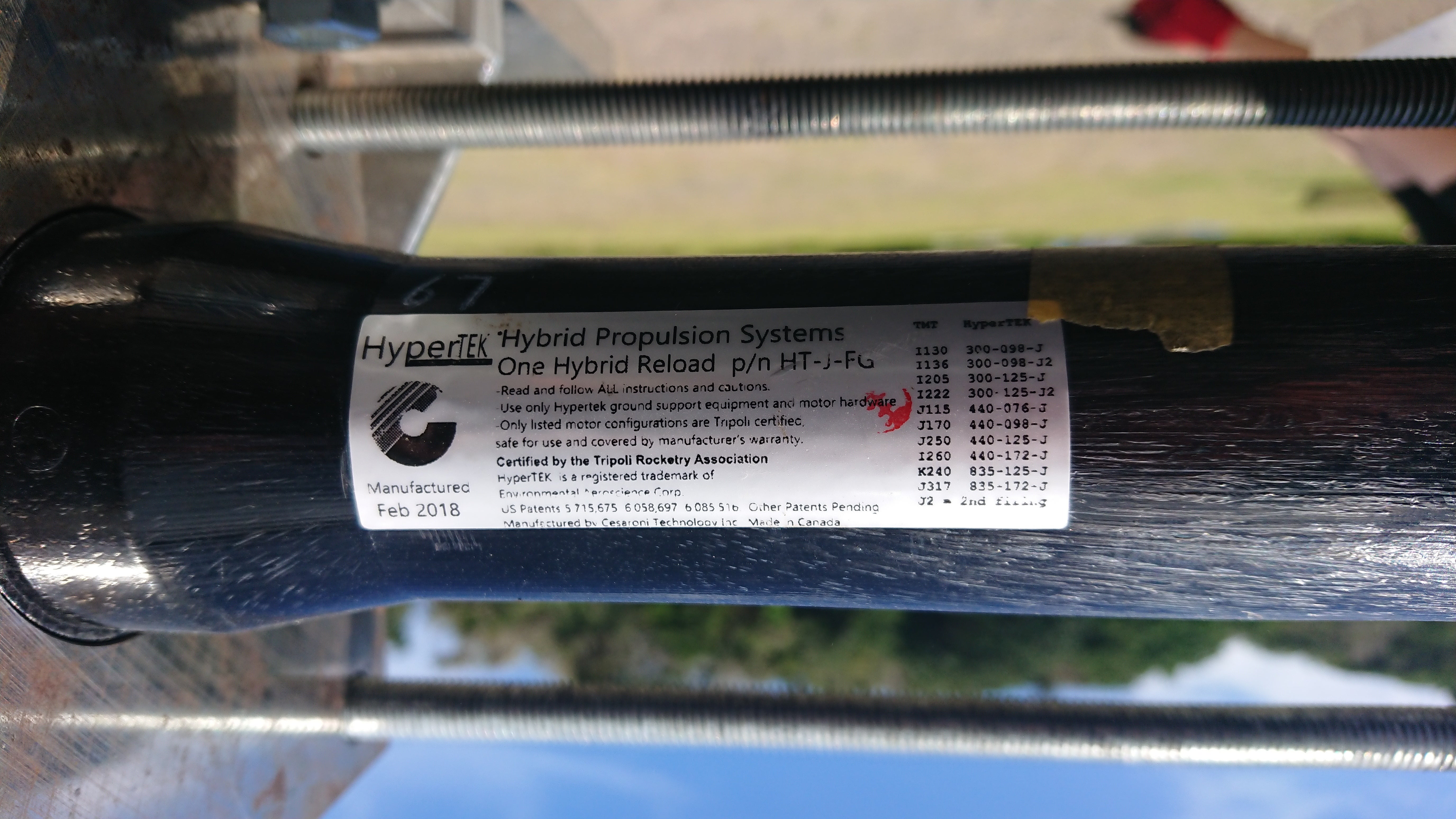 真ん中の黒いコレが燃料で、Hypertek社製のJ型モータです。Thermoplasticというプラスチックが原料なので、単体では燃焼しない安全な燃料です。燃焼実験に使用する主要な部品は3つで、燃料、酸化剤用タンク、インジェクタです。