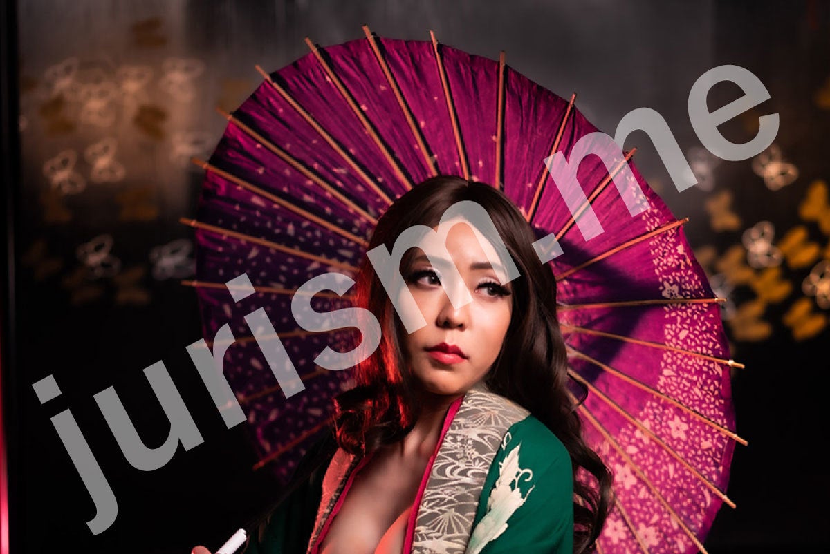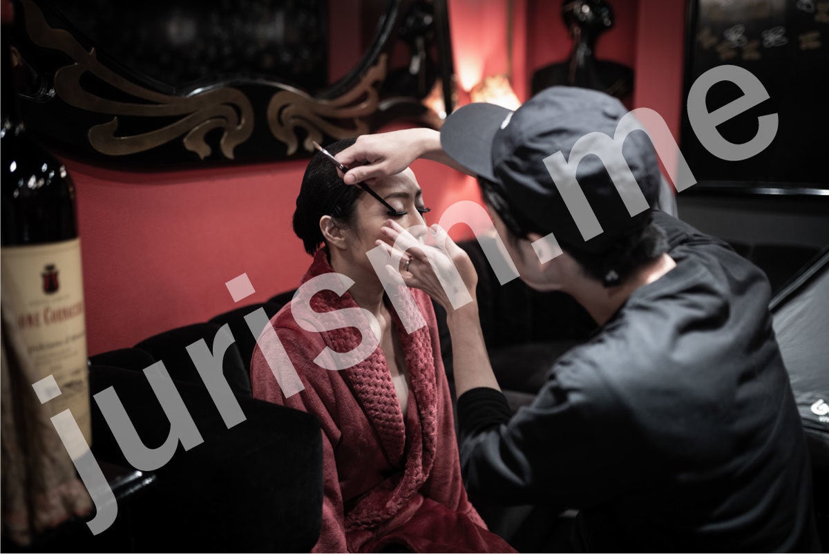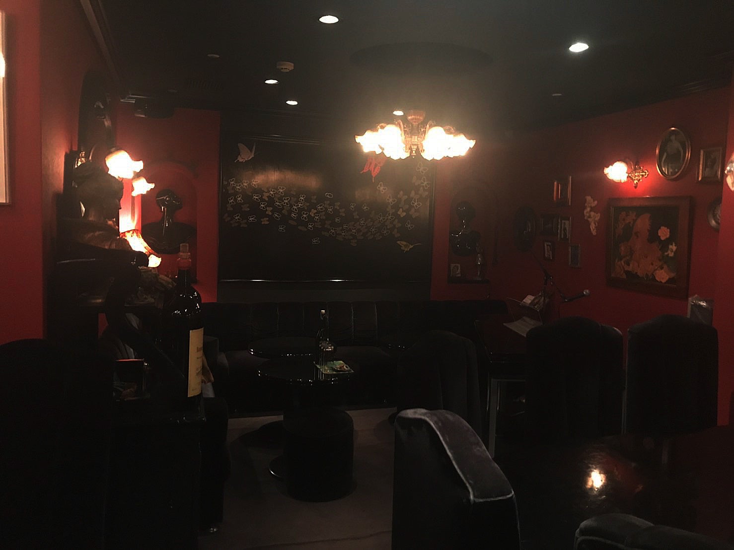 創業39年のピアノラウンジ。真っ赤な壁紙と装飾品がアール・ヌーヴォーな雰囲気を醸し出す異空間。女の子のユニフォームは、肩を妖艶に開いた花魁風の着物。場所と着物を借りて撮影を行い、アール・ヌーヴォーと大正ロマンのマッチングが、スタジオ撮影では成し得ない写真を生み出す。Juriが15年前から通うお店で、オーナーママとも懇意。