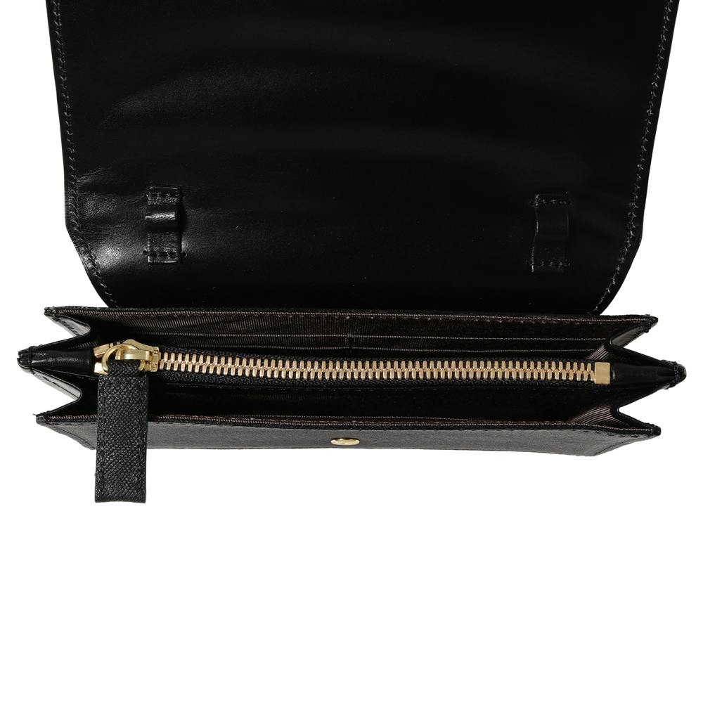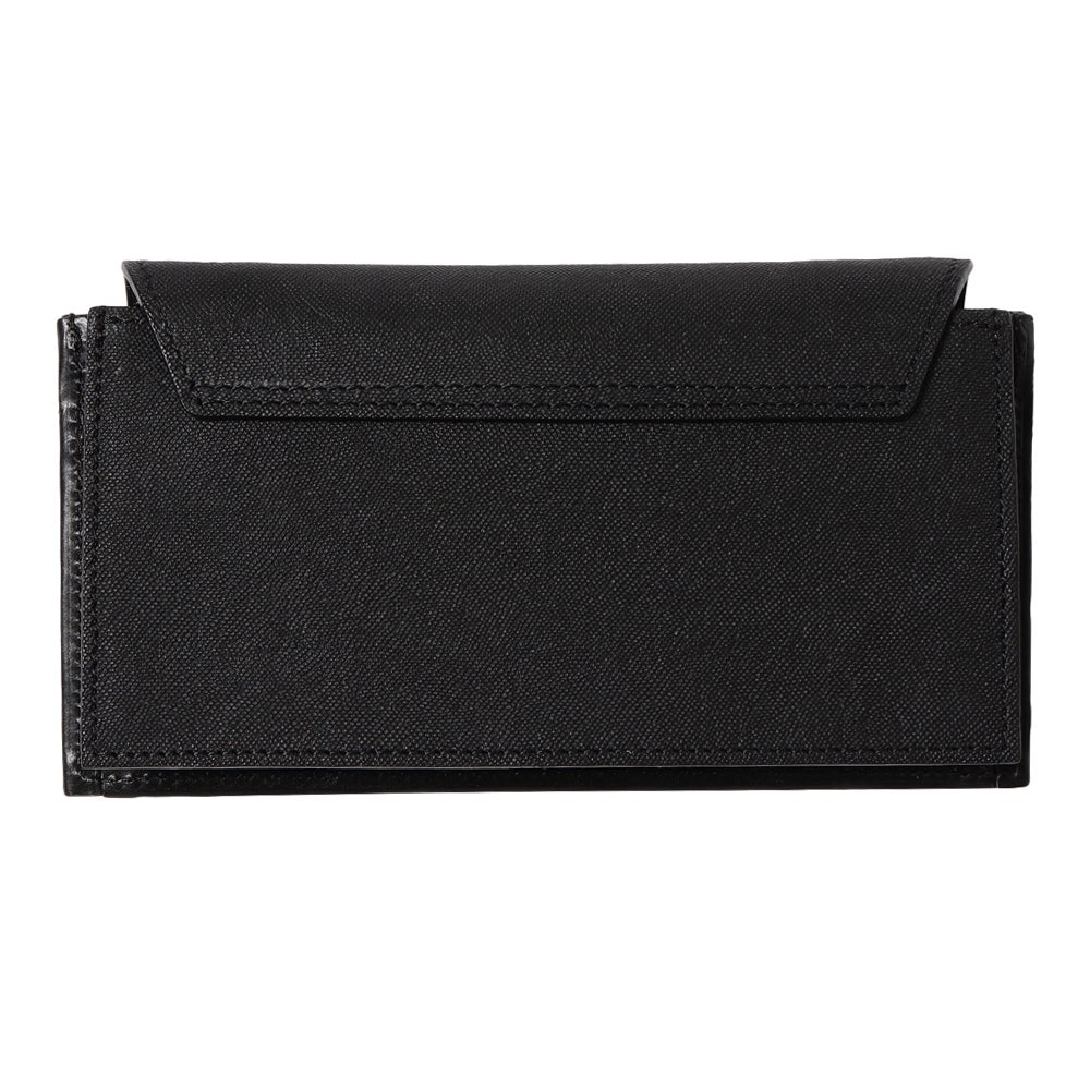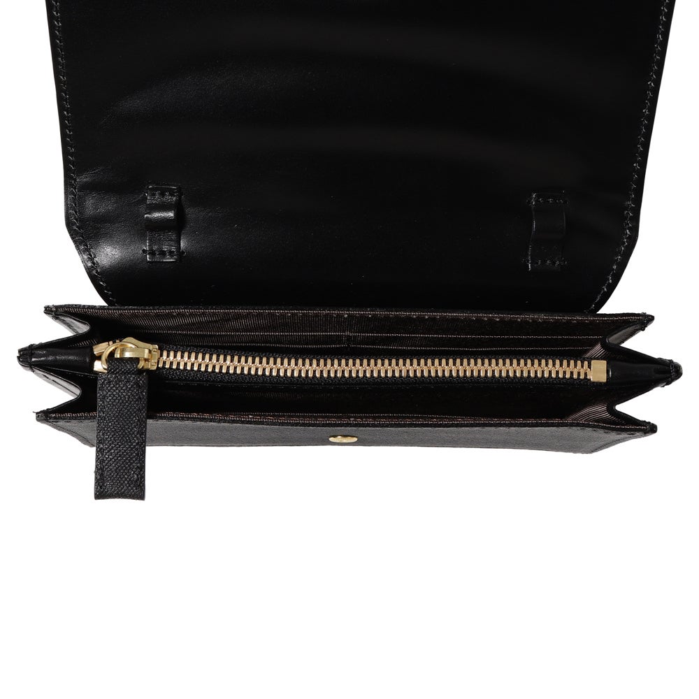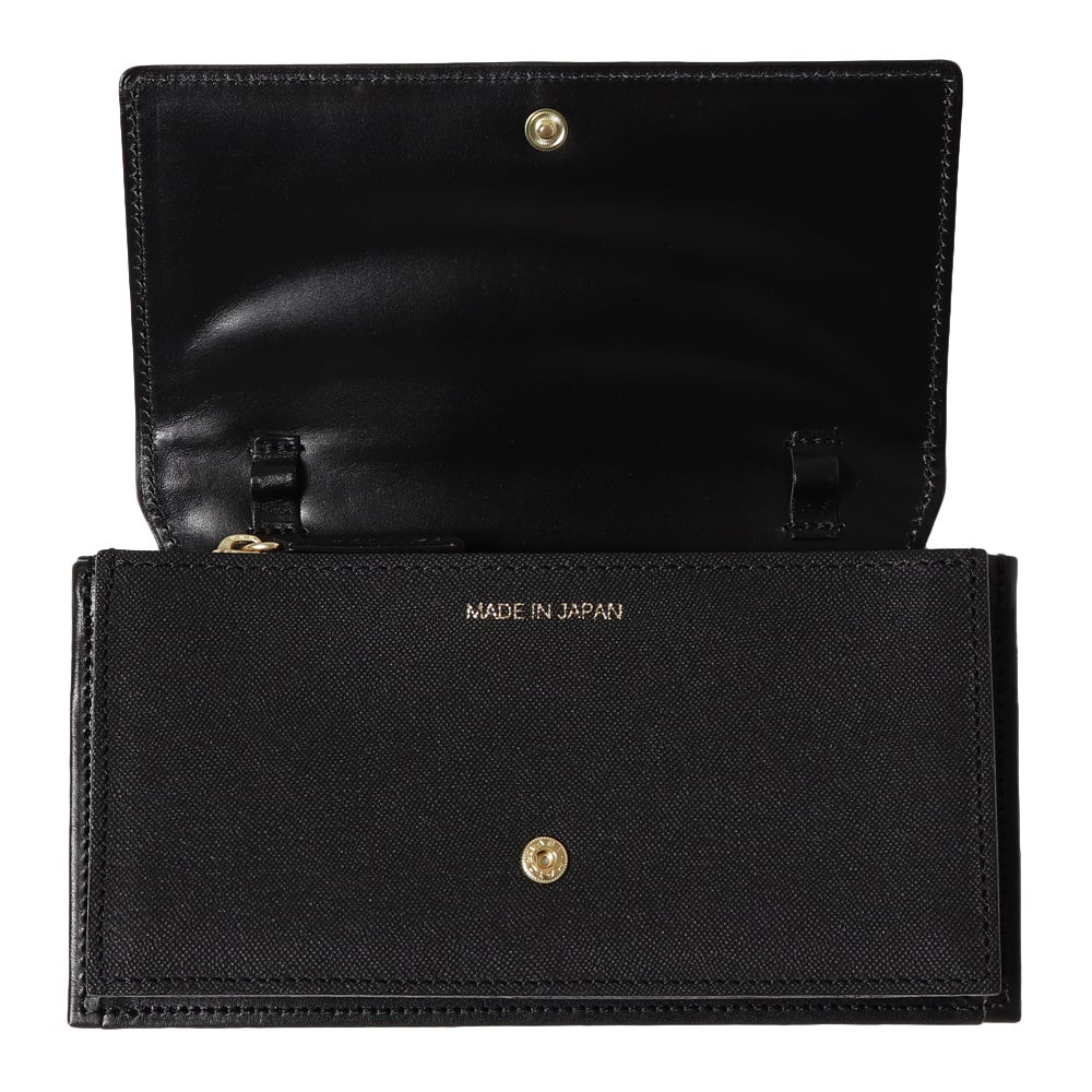 型押し革とヌメ革の素材感のコントラストが特徴のシンプルなロングウォレット。写真はブラック。