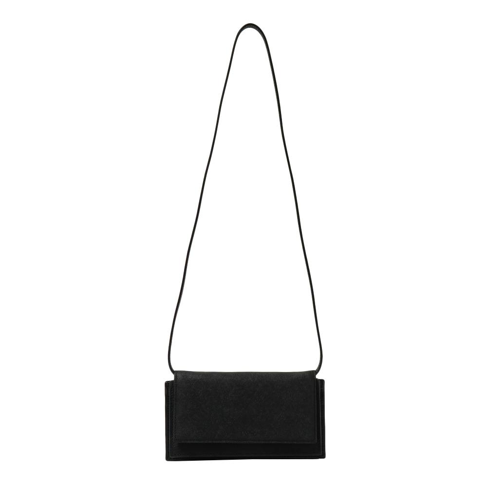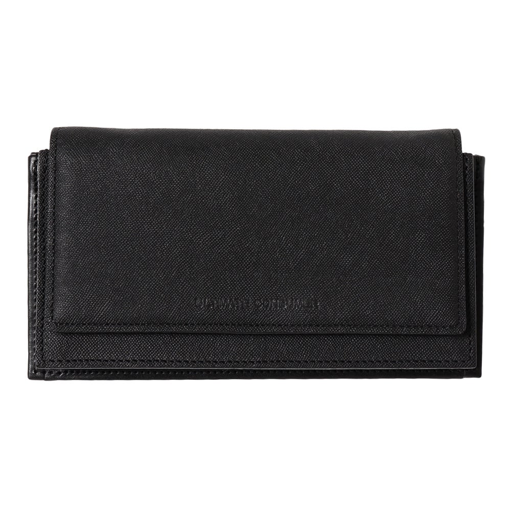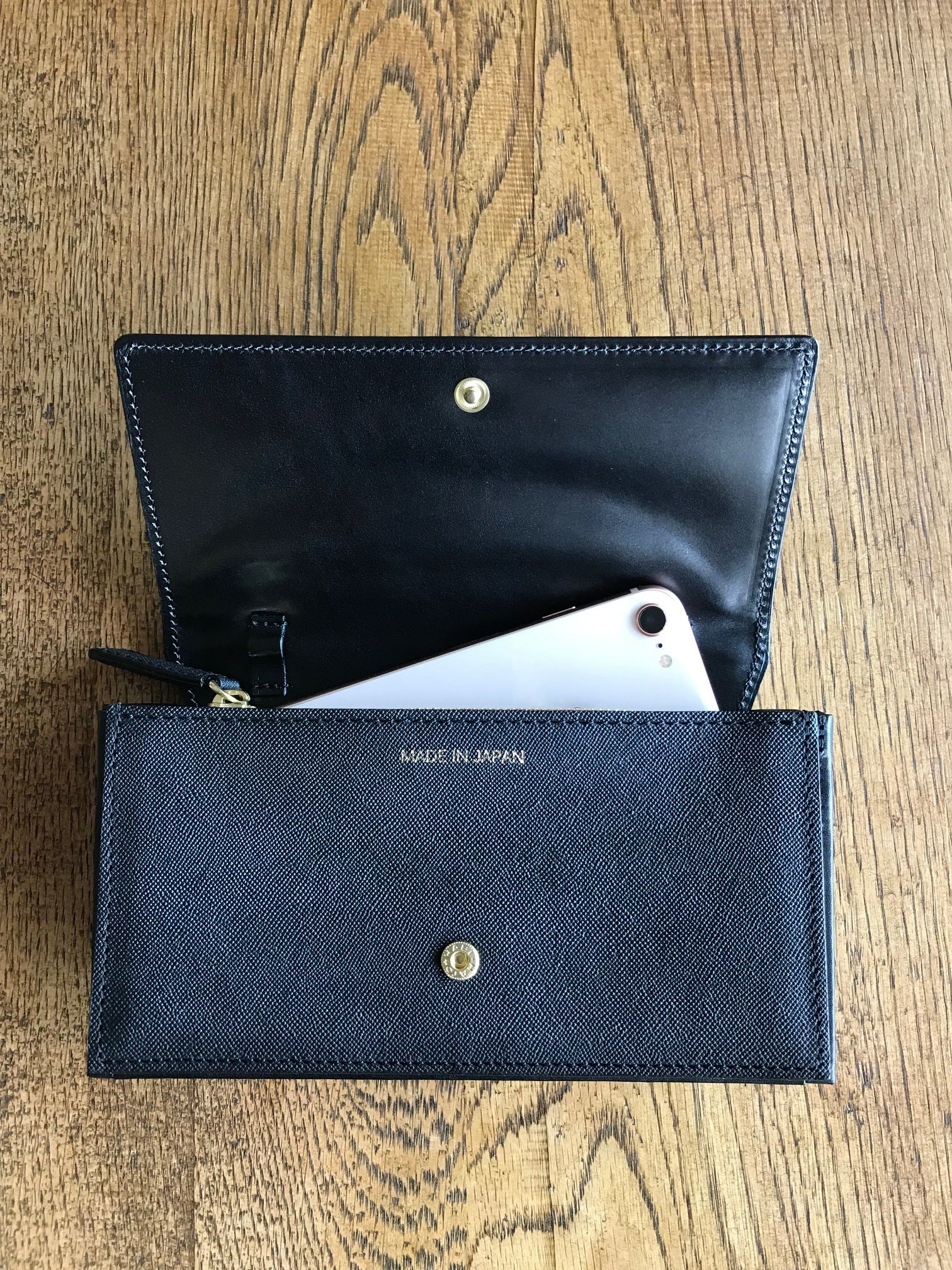 型押し革とヌメ革の素材感のコントラストが特徴のシンプルなロングウォレット。写真はブラック。