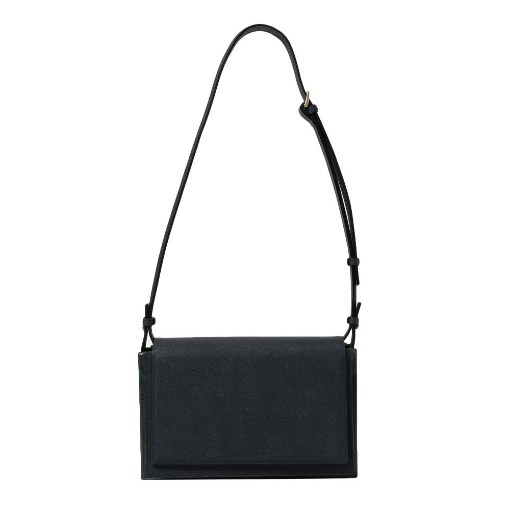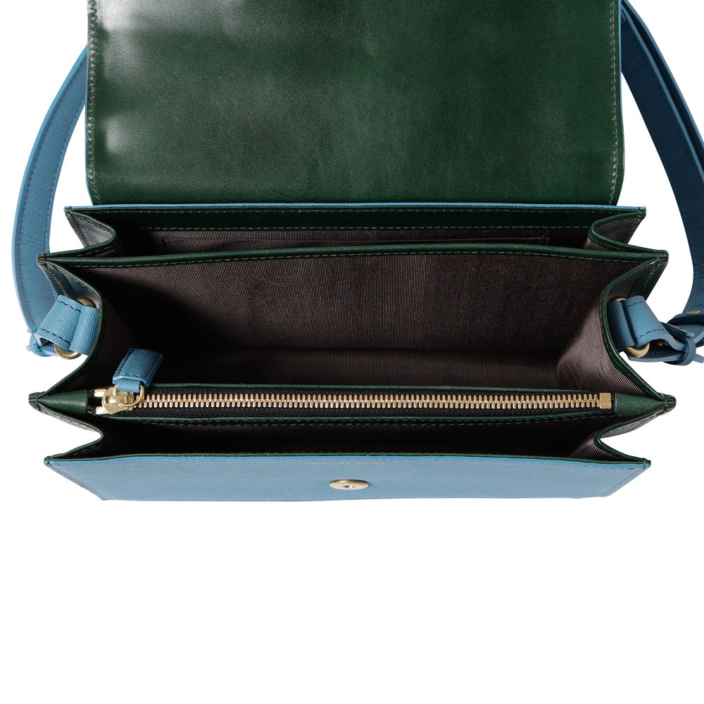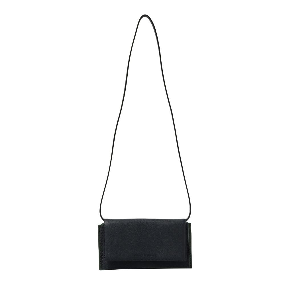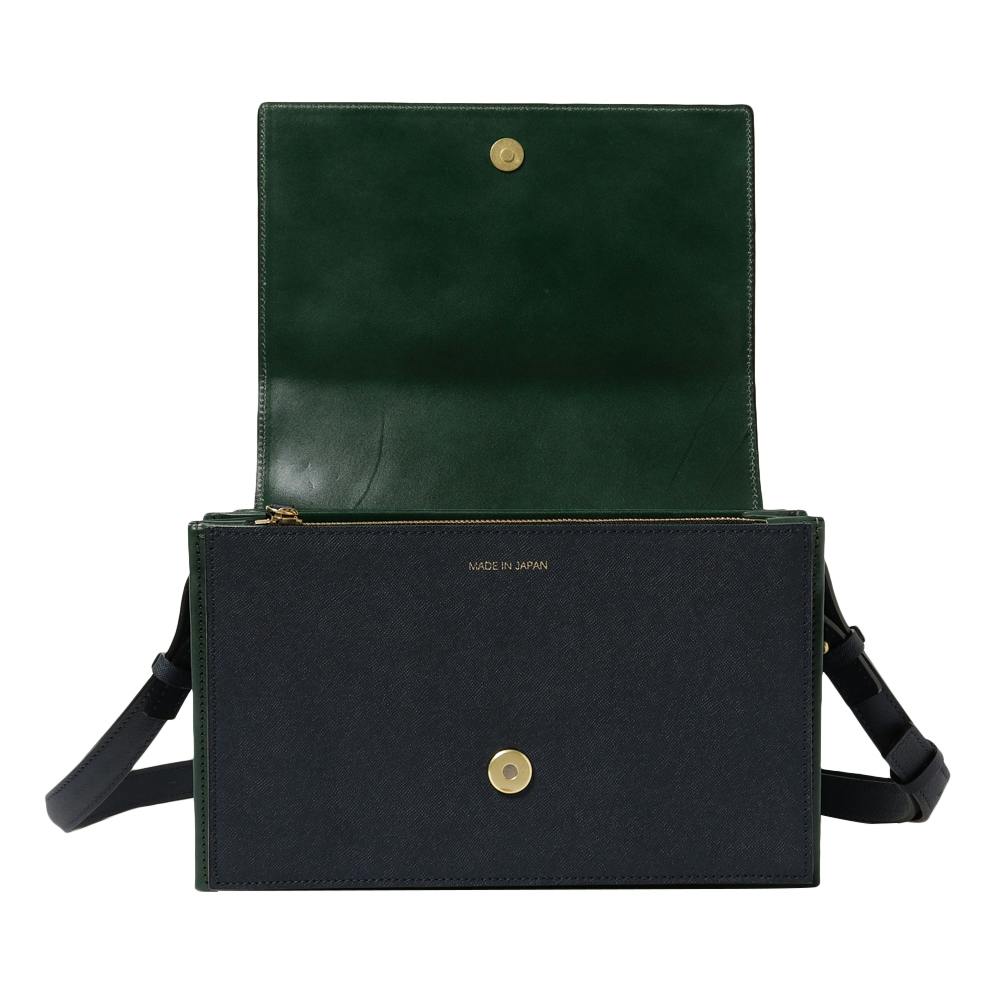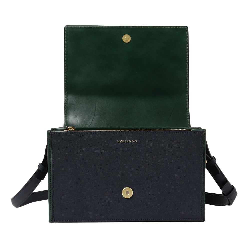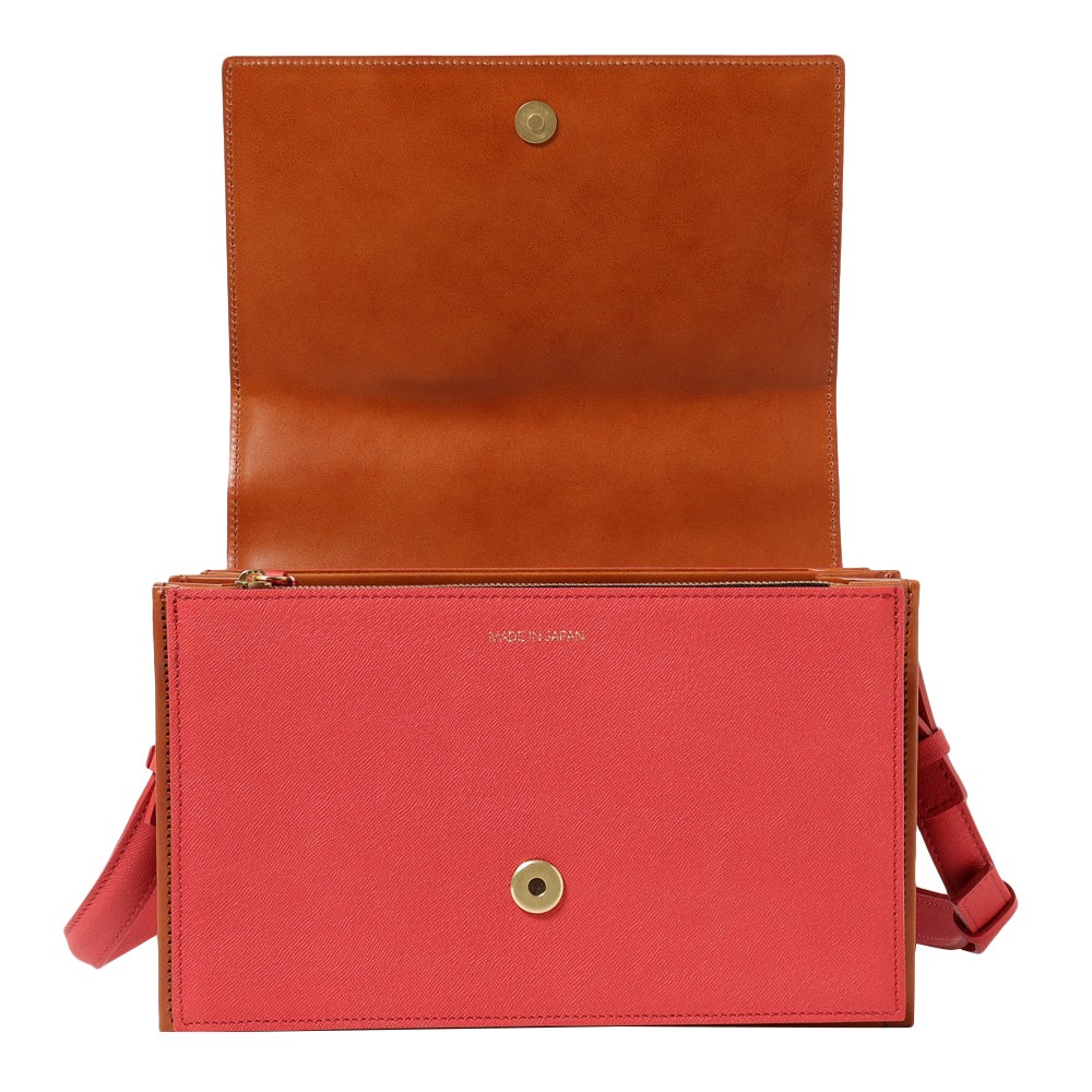 配色がアクセントのシンプルなショルダーバッグ。型押し革とヌメ革の素材感のコントラストが特徴。