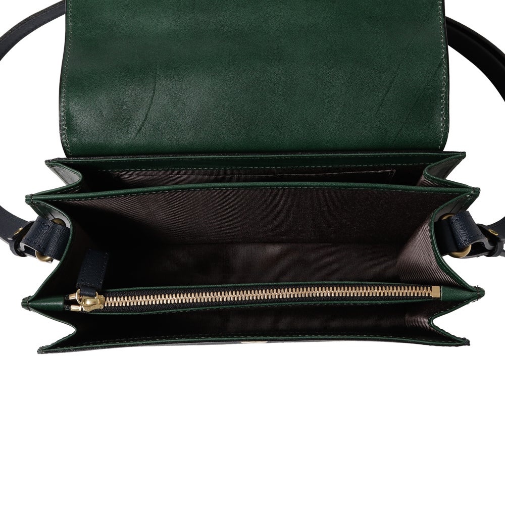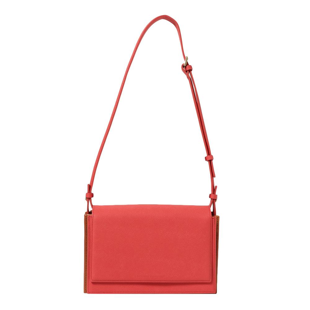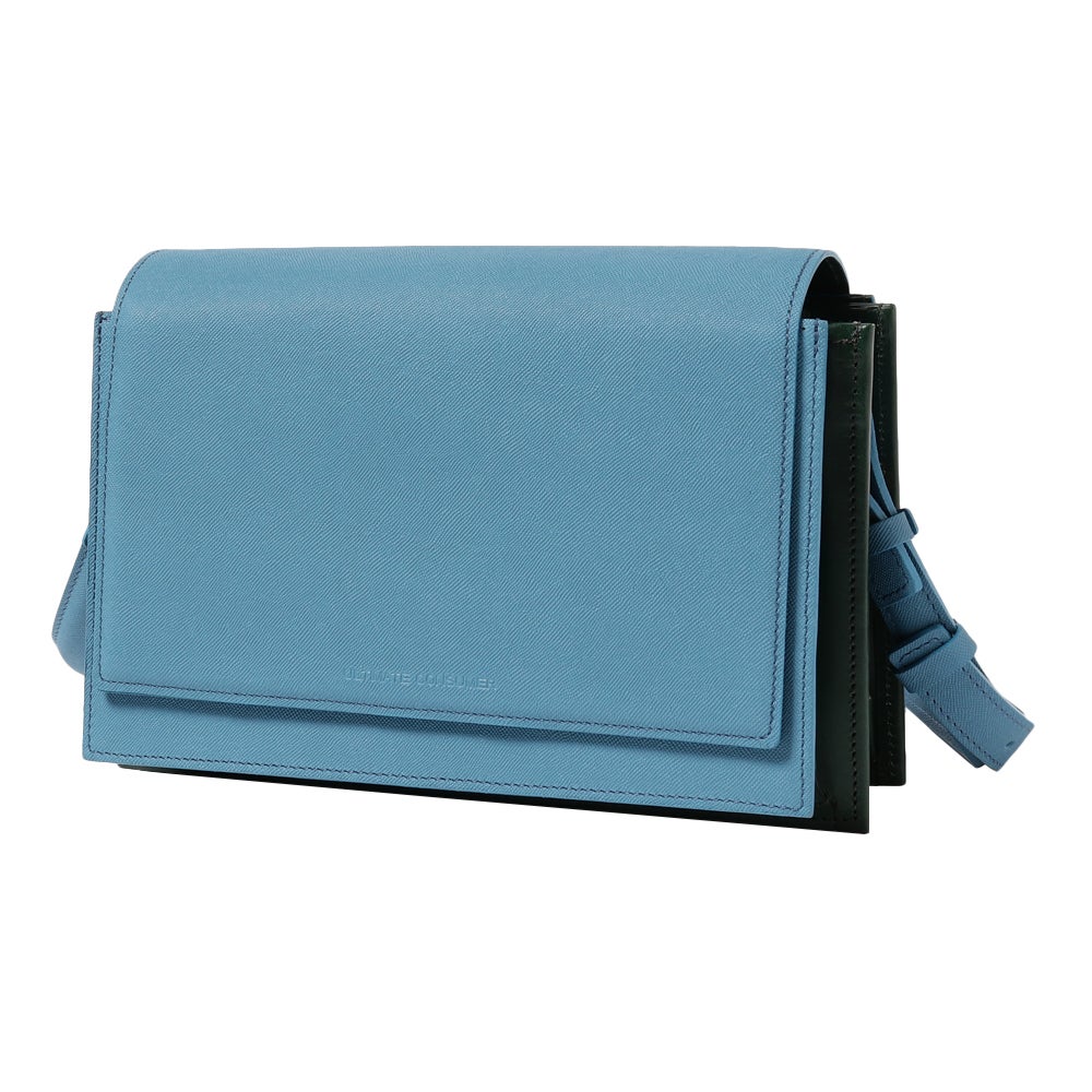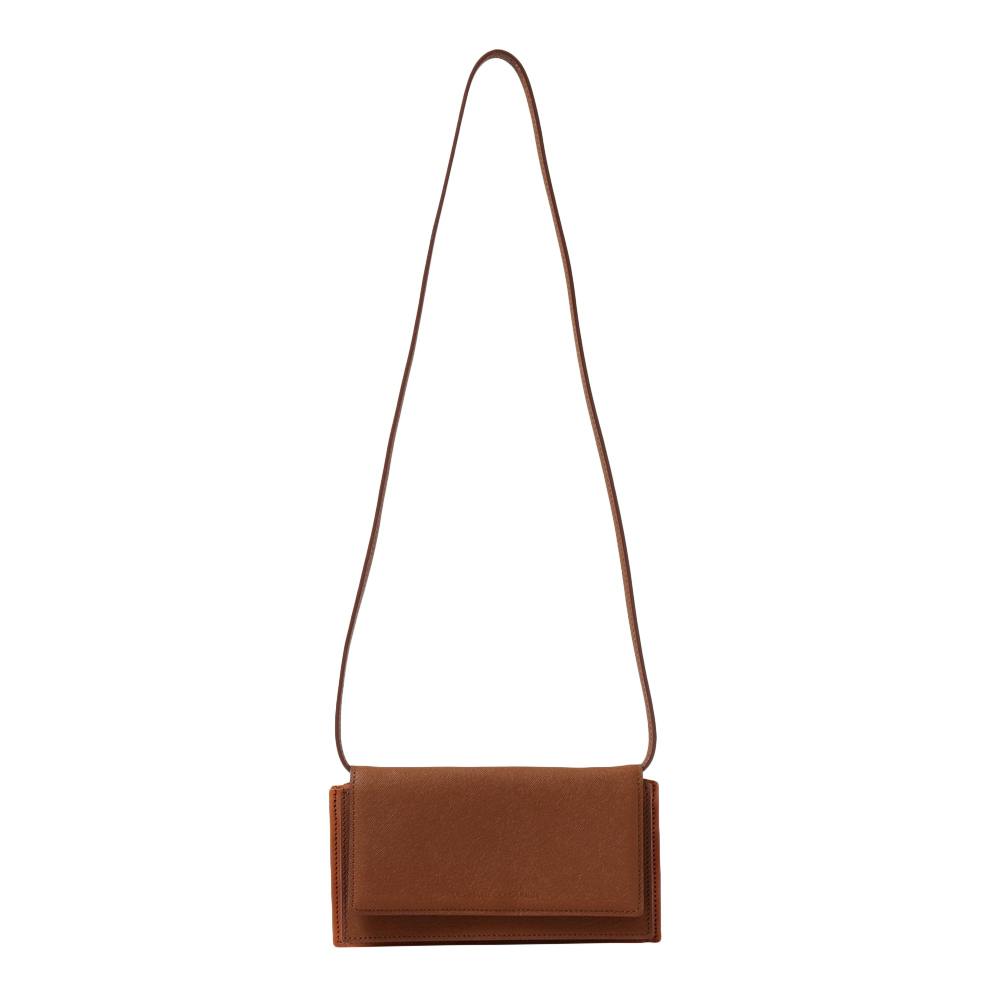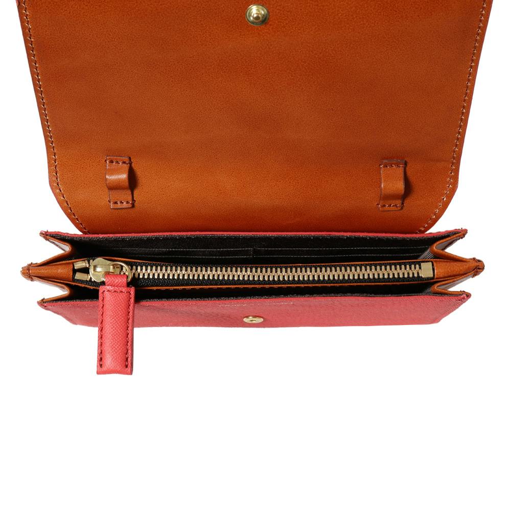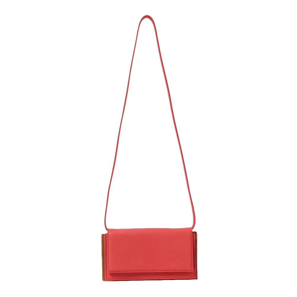 配色がアクセントのシンプルなショルダーバッグ。型押し革とヌメ革の素材感のコントラストが特徴。