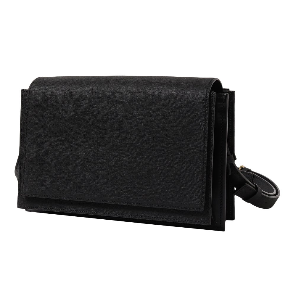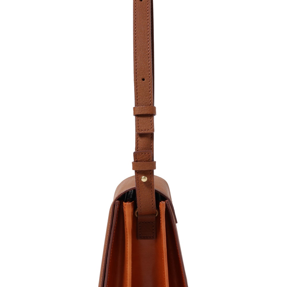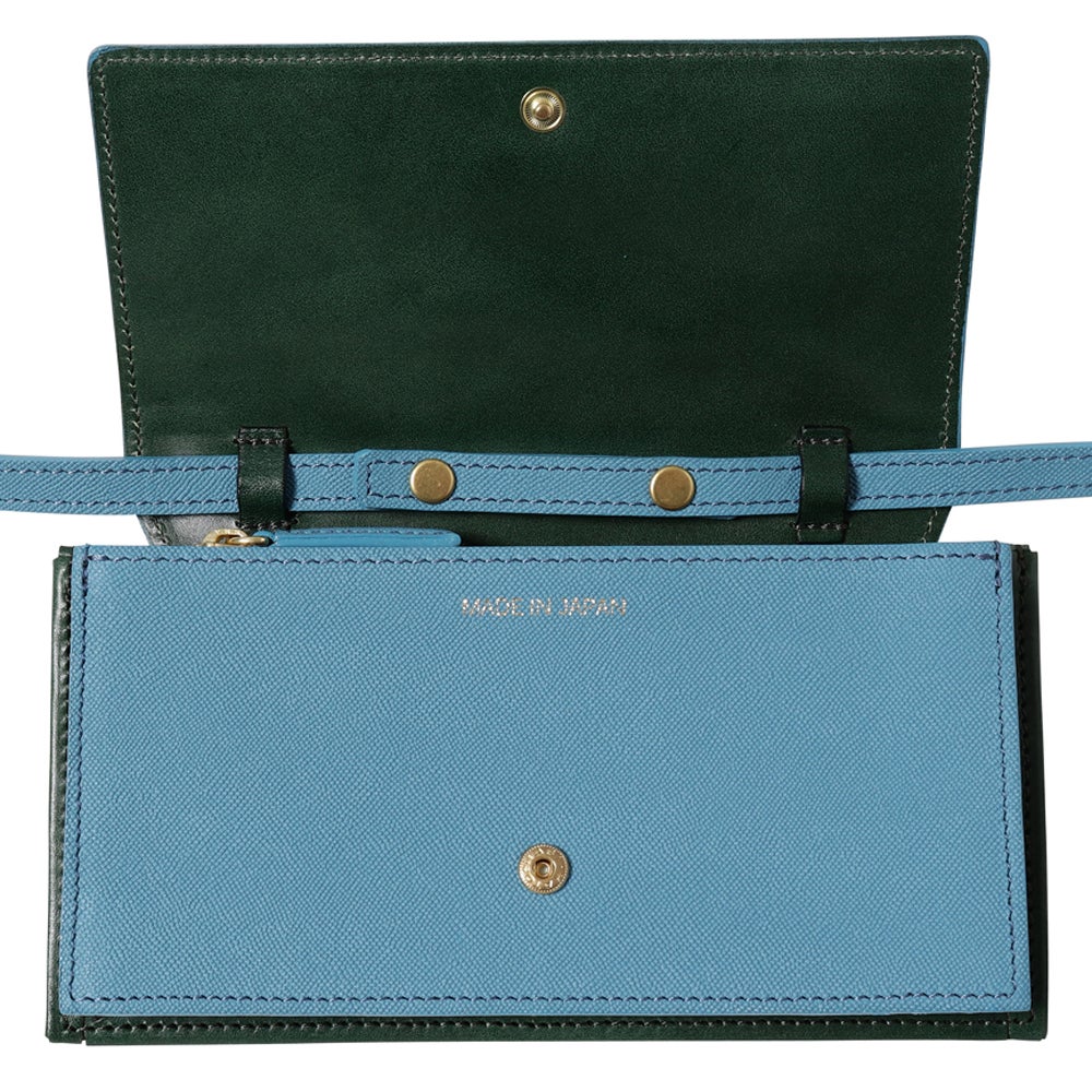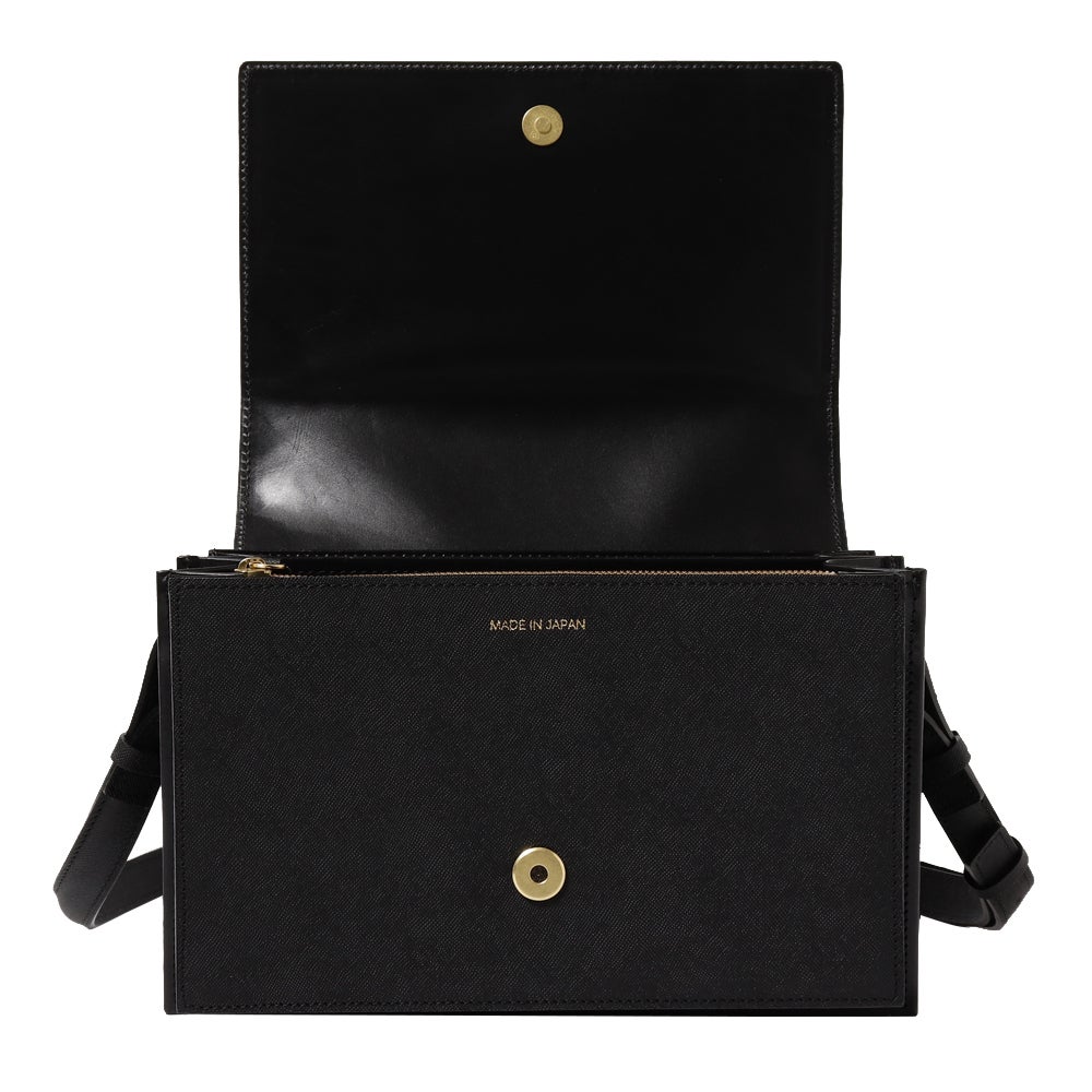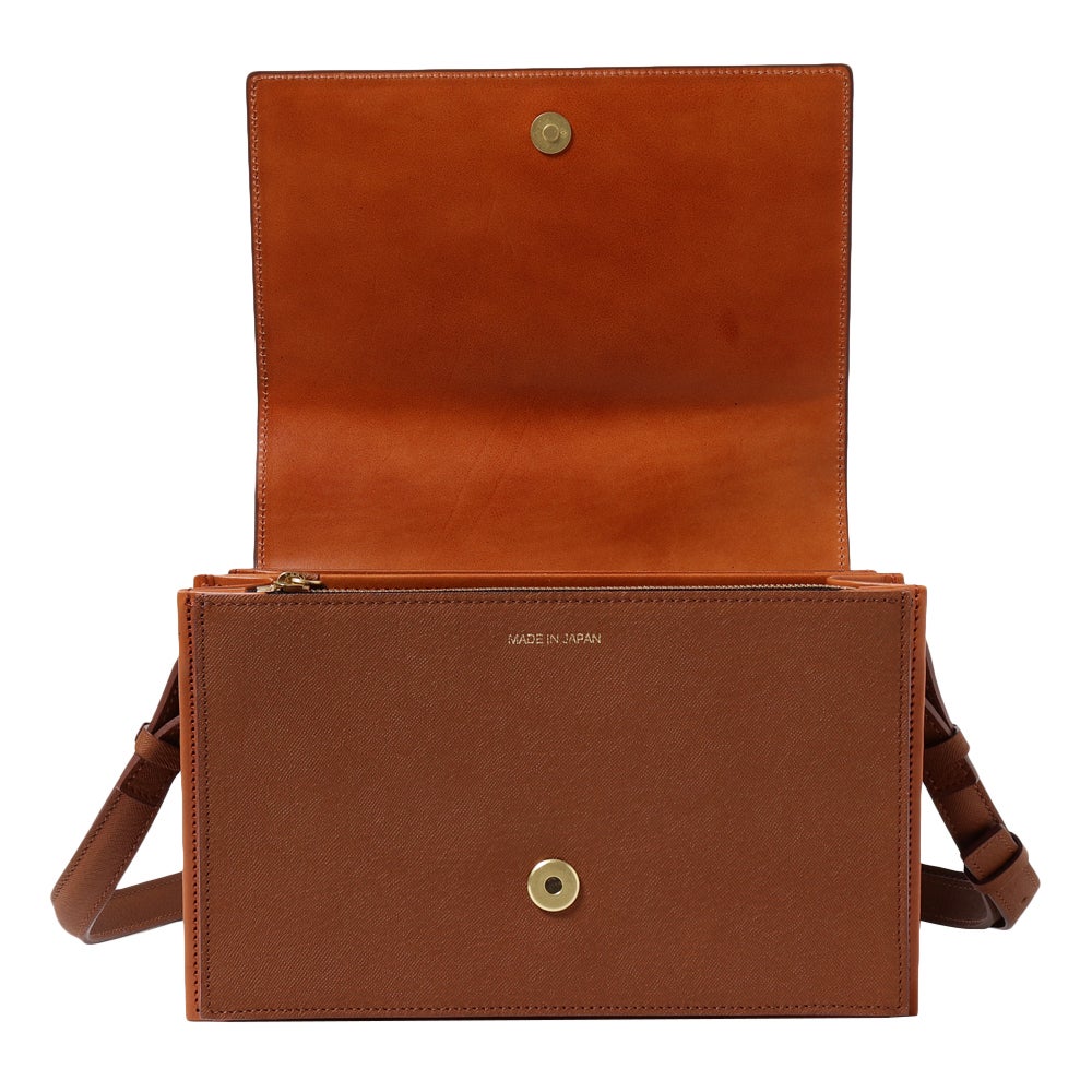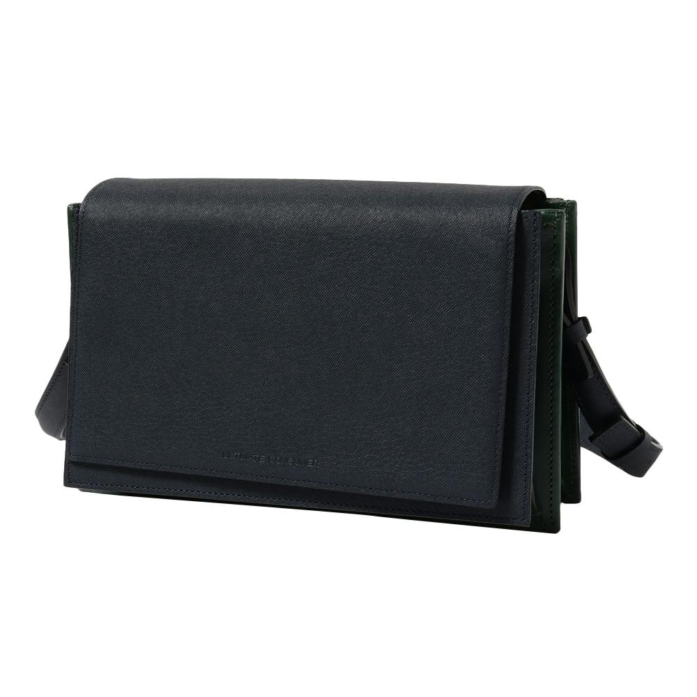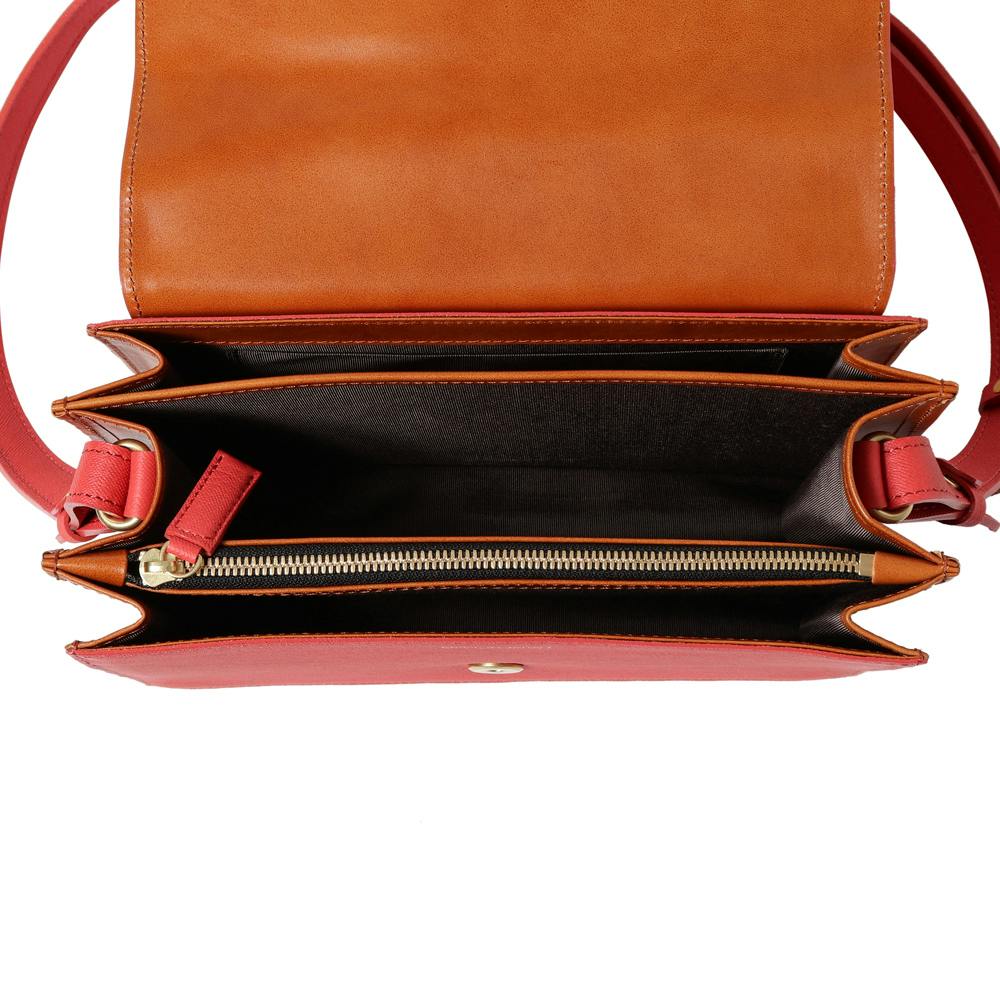 配色がアクセントのシンプルなショルダーバッグ。型押し革とヌメ革の素材感のコントラストが特徴。