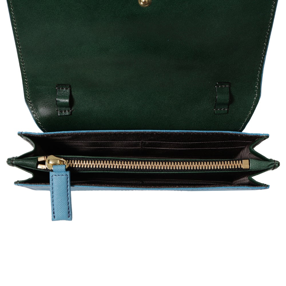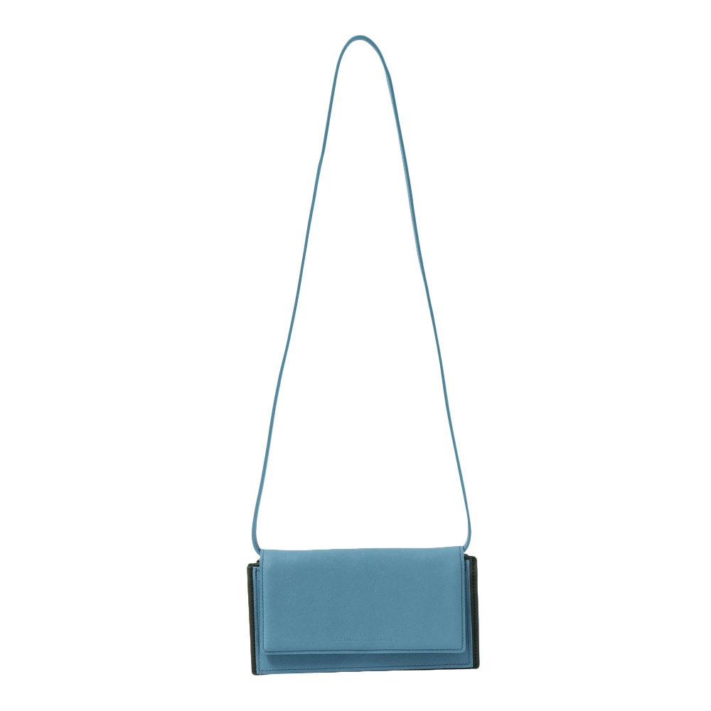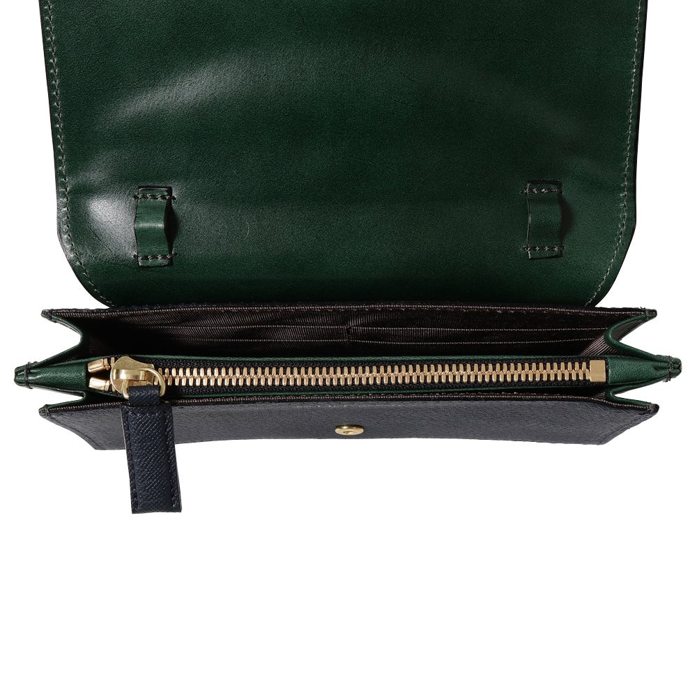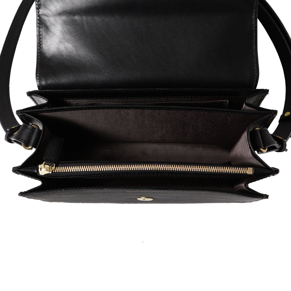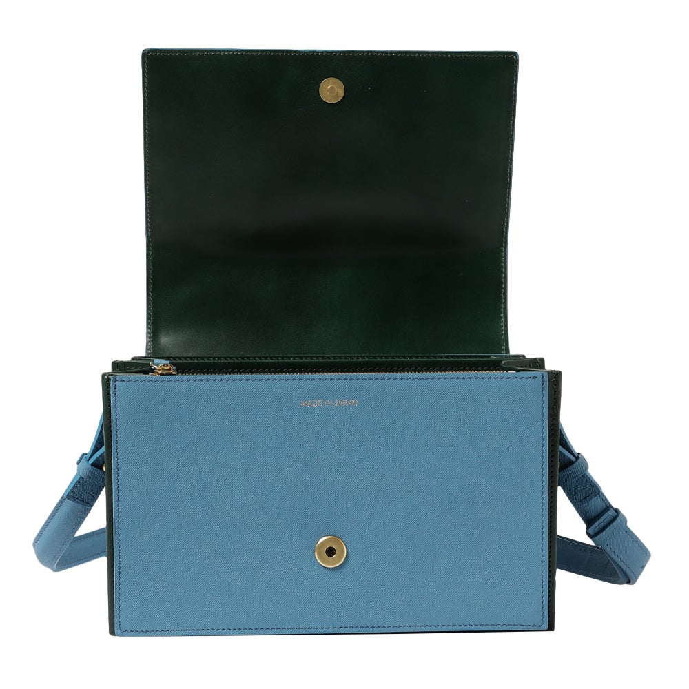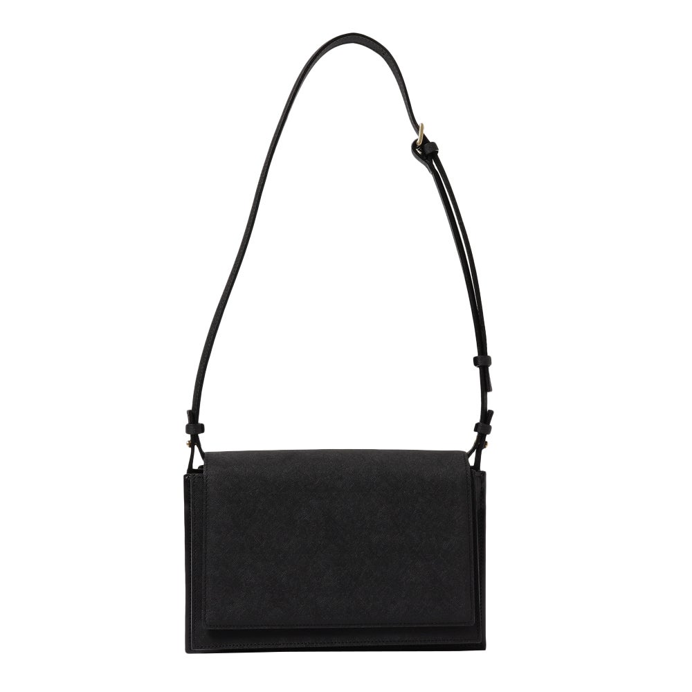 配色がアクセントのシンプルなショルダーバッグ。型押し革とヌメ革の素材感のコントラストが特徴。