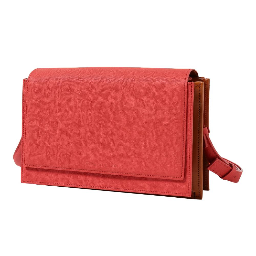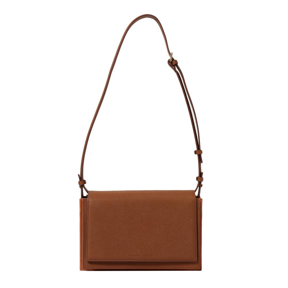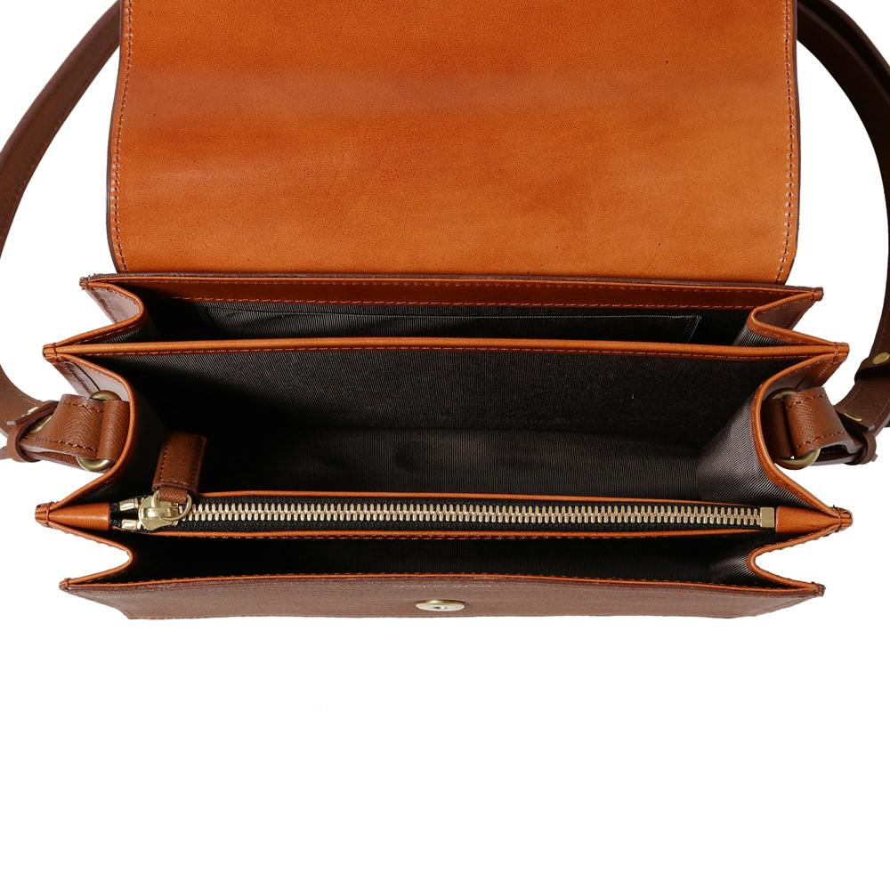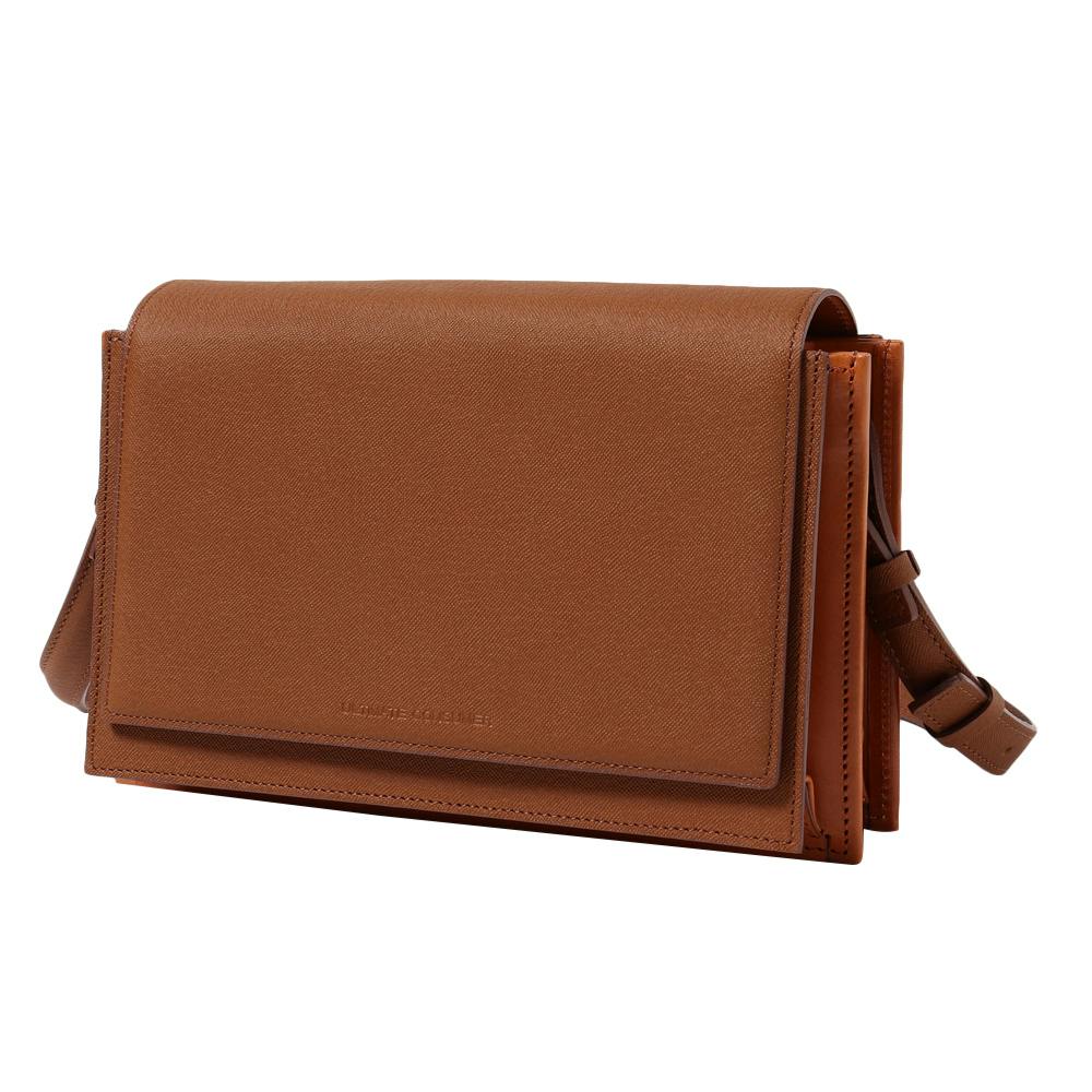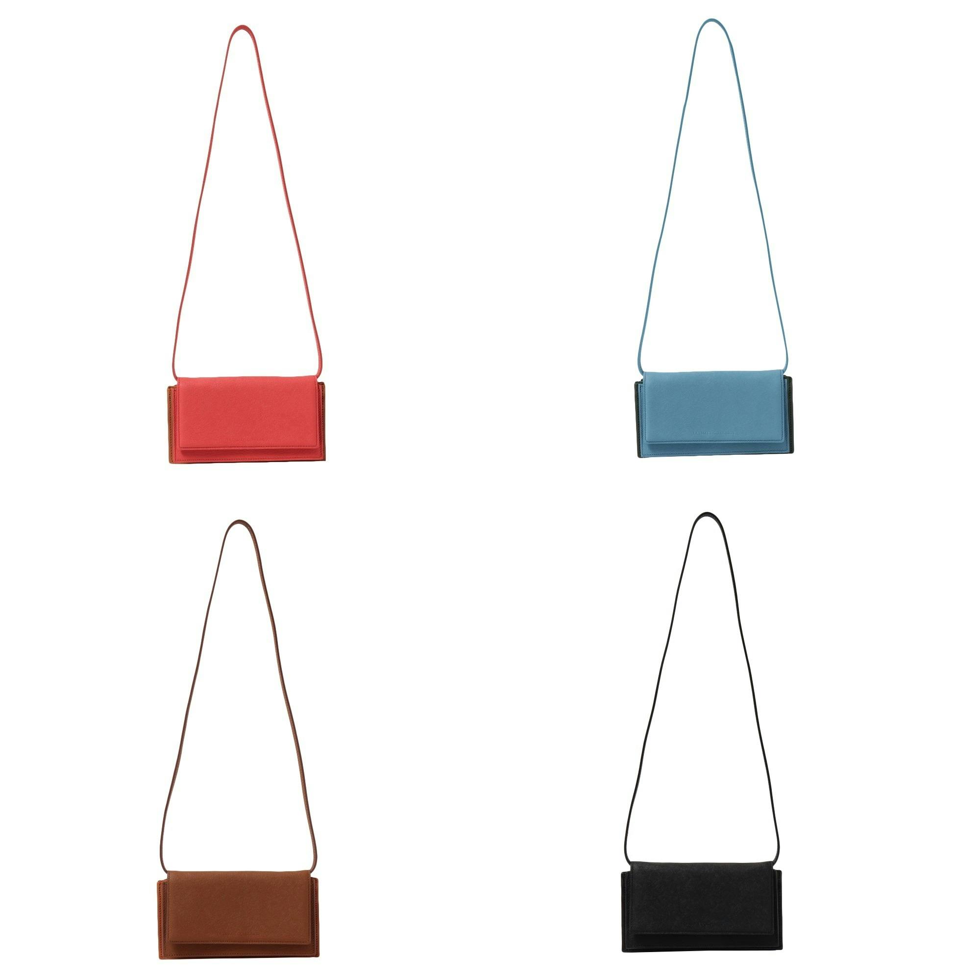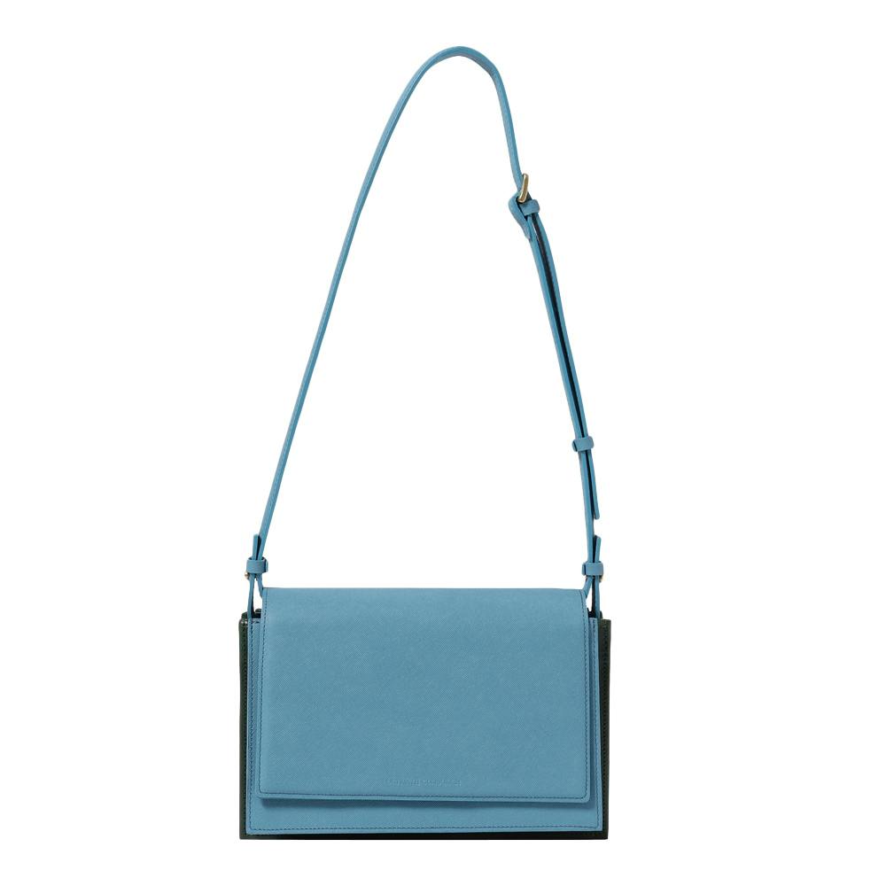 配色がアクセントのシンプルなショルダーバッグ。型押し革とヌメ革の素材感のコントラストが特徴。