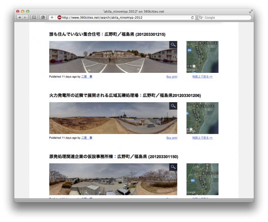 2012/06/17 02:26皆様、大変永らくお待たせ致しました。 実は去る6月1日に、 本プロジェクトによって撮影されたパノラマ画像を、 やっと公開することが出来ました。 ご報告が遅れましたことを、 まずはお詫び申し上げます。 コンテンツは合計でちょうど300点。 当初より大幅に少ない数ではありますが、 各地点での撮影点数と、 それを横断的に見ることが出来る、 非常に貴重な資料になったのではないかと思います。 現在は、360citiesという、 世界最大のパノラマVRポータルサイトに上がっております。 下記URLで全てご覧いただけますので、 ぜひアクセスして下さい。 http://www.360cities.net/search/akila_ninomiya-2012 実は今、日本に居ません。 次の活動報告で詳しくお話します。 帰京は6月21日を予定しています。 そこから次は、リターンの制作に入る予定です。 どうぞよろしく御願い申し上げます。 もっと見る