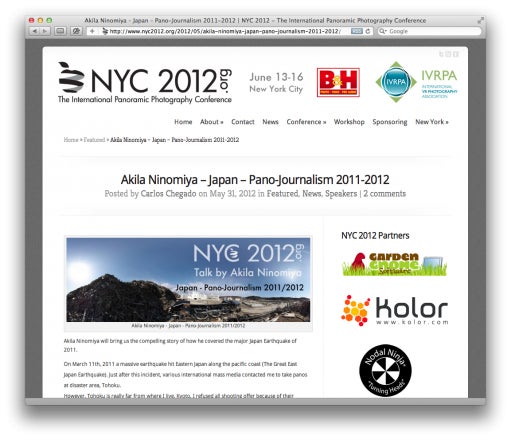 2012/06/17 02:40引き続き、もう一つの活動報告を行います。 本プロジェクトの一区切りがパノラマの完成と公開にあるとしたら、 その後で、講演などによって周知していただくことも、 非常に大切な活動だと、私は思っています。 昨年は4月1日に「Japan-Pano-Journalism」が公開されてから、 すぐに関係個所にコンタクトを取り、 多くの講演会で喋らせて頂きました。 今年はタイミング的にも、良い講演会が無く、 どうしようかと思っておりました。 そこに、 私が加盟しているパノラマクリエイター/フォトグラファーの国際団体、 「IVRPA(International VR Photography Association」の年次総会が、 ニューヨークはマンハッタンのど真ん中で、 6月13日から16日まで開催されるということを知り、 まさにこの場で講演を行い、 特に意識の高い、 100名近い世界中のトップパノラマフォトグラファーの前で、 昨年の活動の報告と御礼も兼ねて講演を行い、 被災地への継続支援を訴えられたら、と思い立ちました。 講演詳細は、下記サイトでご覧いただけます。 ・Akila Ninomiya – Japan – Pano-Journalism 2011-2012 | NYC 2012 - The International Panoramic Photography Conference http://www.nyc2012.org/2012/05/akila-ninomiya-japan-pano-journalism-2011-2012/ そして、去る6月13日、私は初日の3番目という、 場にまだ緊張感が漂う中で、 本プロジェクトの経緯や想い、 そして今後の展開についてお話してきました。 講演は全て英語で行われましたので、 英語が苦手な私は、 多くの方々の支援でスピーチ文を英語で起こして頂き、 当日はそれを45分間、読み上げるだけという形式になってしまいましたが、 聴講された皆様には、大きく感心をいただけました。 そして本日、まさに本会の最終日でした。 残る1つのプログラムの前のランチタイムに、 たまたまネットが使える環境に恵まれましたので、 こうして活動報告をさせていただいている次第です。 6月21日に帰京する予定です。 その後は、リターンの制作に入りたいと思います。 パトロンの皆様には、その旨のメールを改めてお送り致します。 引き続き、よろしくお願い致します。 もっと見る