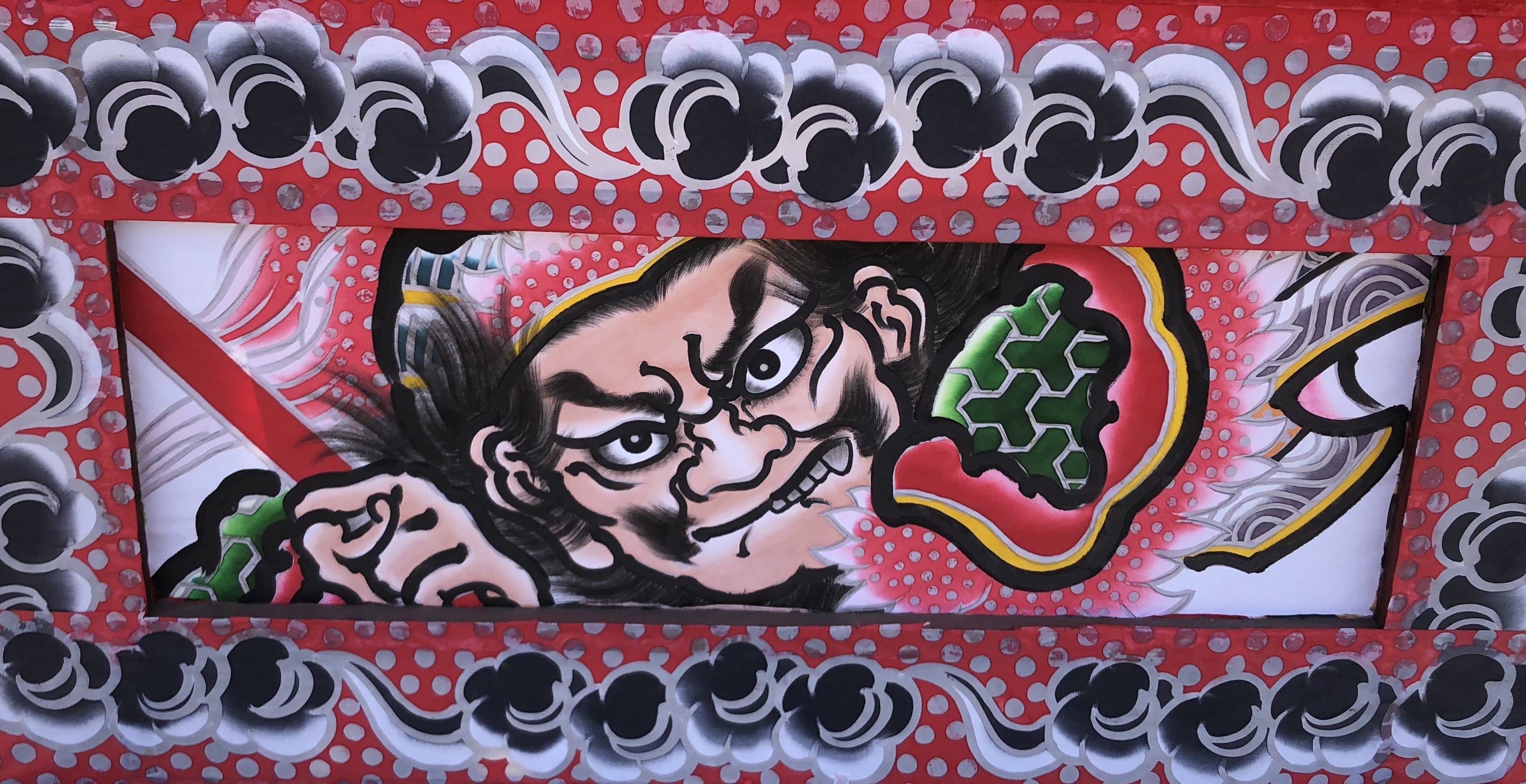 HIU最大のイベント、ホリエモン万博のキービジュアルを再現したねぷた絵(後ろ絵)を切り取り、堀江貴文氏にサインを頂きお届けします。