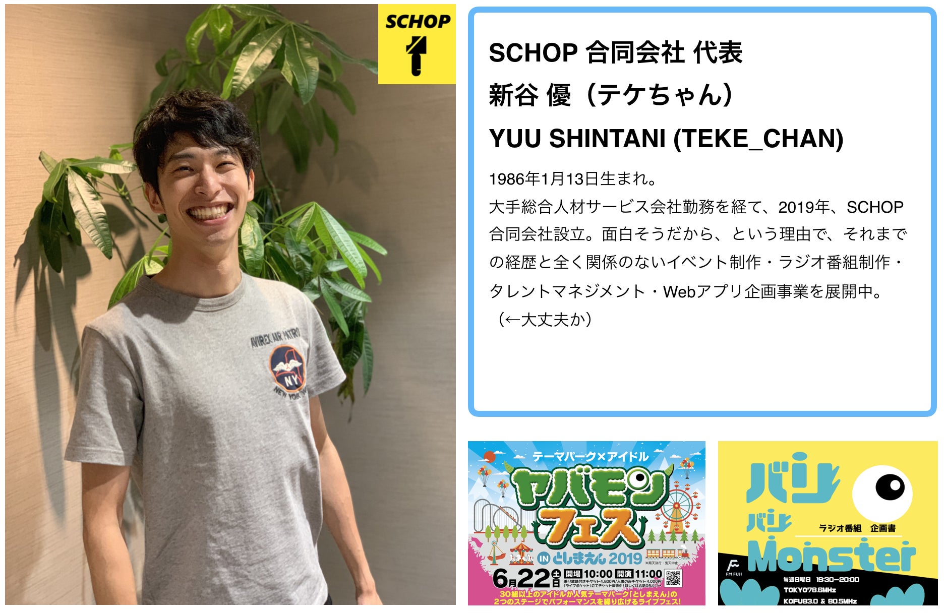 「才能たちが、スポットライトを浴びて、相応の評価を得られる未来」を実現するためにこのプロジェクトを立ち上げました。アプリ名であるSCHOP(スコップ)には、「埋もれている才能を掘り起こす」という意味が込められています。素晴らしい才能たちに日の当たるステージを用意する。それが僕たちの使命であり、すべてのプロジェクトにおける考え方の原点です。このアプリから爆発的な人気のあるアイドルを輩出できる未来を夢見ています!