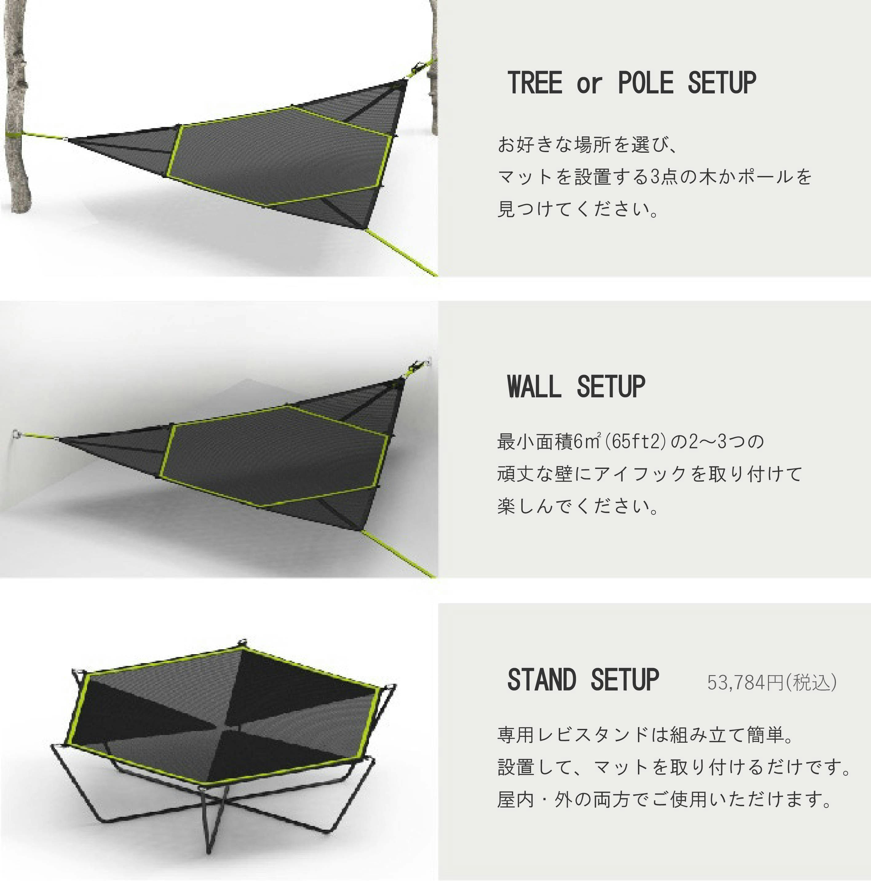 「エアリアルマット」に必要なのは3点(木、柱、またはフック)だけ。
