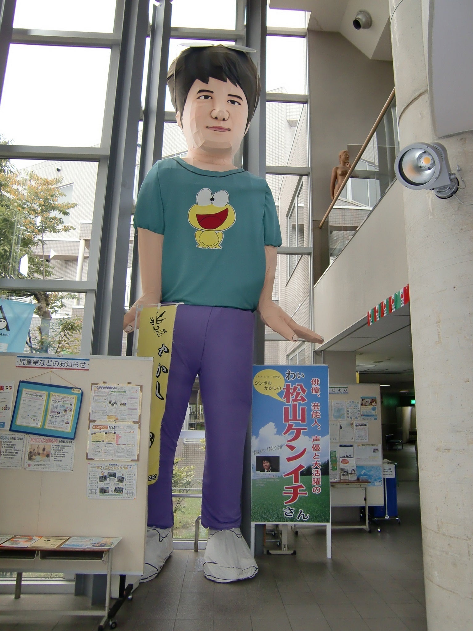 松山ケンイチさんは油川市民センターホールピコ太郎の向かい側でぴよん吉と一緒にお出迎えしています。