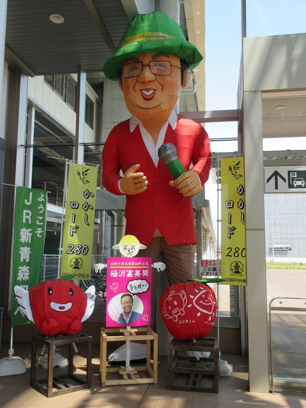 梅沢富美男さんは新青森駅北口入り口で笑顔でお客様をお出迎えしています。