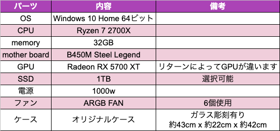 また、ハイエンドクラス(Radeon 5700XT)からミドルクラス(Radeon RX 580 Gaming)までのPCを用意することによって、皆さんの環境にあったPCをリターンでお選び頂けます。