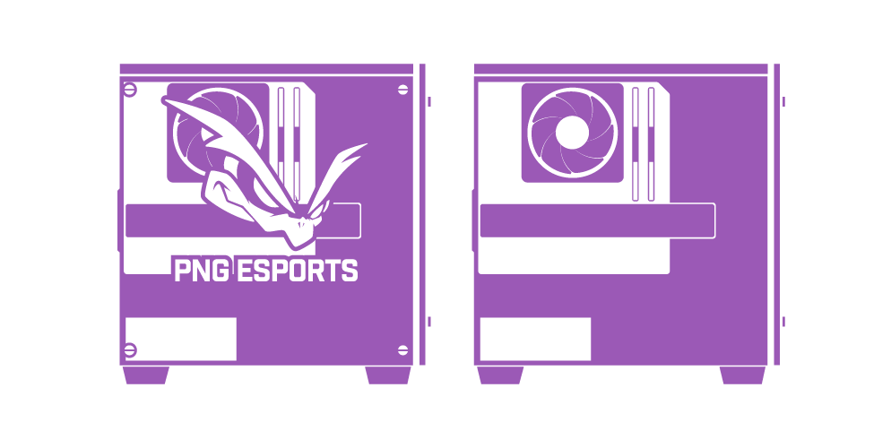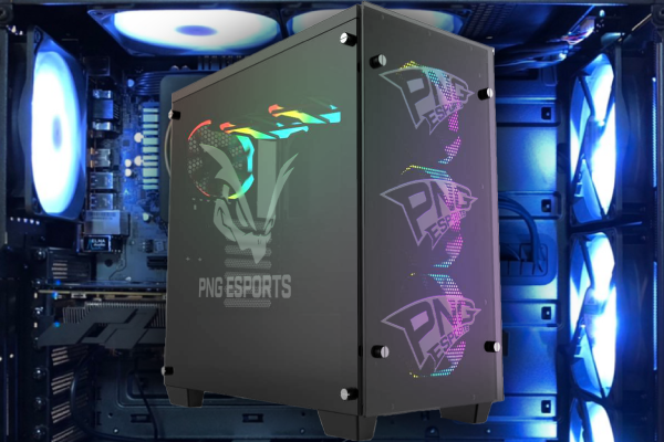 ※イメージ「PNG esports」のロゴをガラス面のPCケース(表面、側面)に刻印しました。ガラスPCケースの中から光るファンがPNGのロゴを綺麗に照らしてくれること間違いなし!