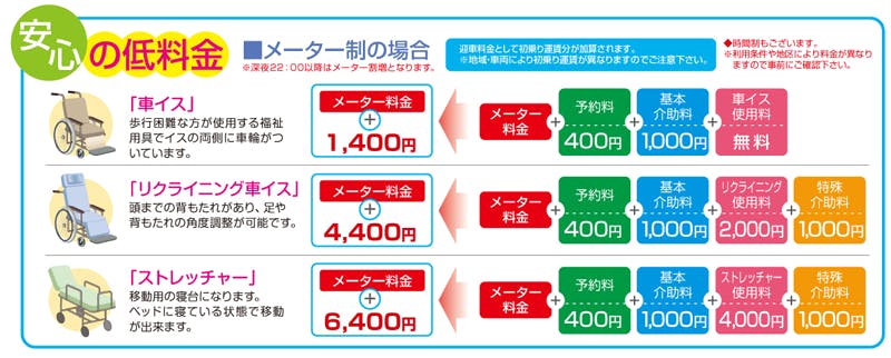 - ・介護タクシーとは? タクシー事業を許可されたヘルパーの資格取得者が身体介助と運行を行うタクシーの事。車椅子がそのまま入る専用タクシーで中にはストレッチャー乗車も出来、救急車に近い設備も整う民間救急車も広義の意味でこの介護タクシーに入る。 運賃+介助料金(機材使用料も含む)の合計が利用料金となる。