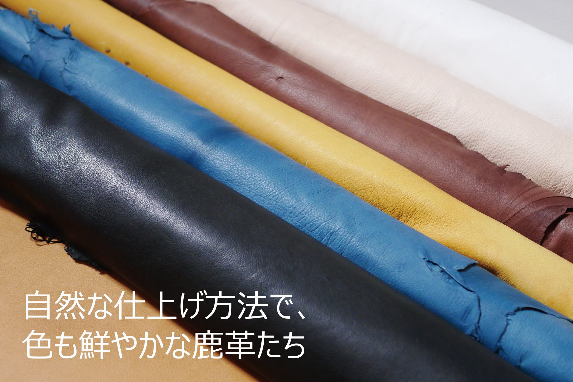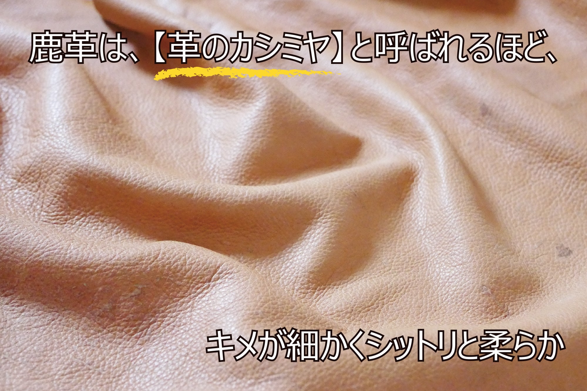 鹿革は、革のカシミヤと呼ばれるほどキメが細かくしっとりと柔らかです。また、適度な伸縮性を持っているので、裂け強度は他のレザーより高く、油分が抜けにくく、しなやかさを失いません。