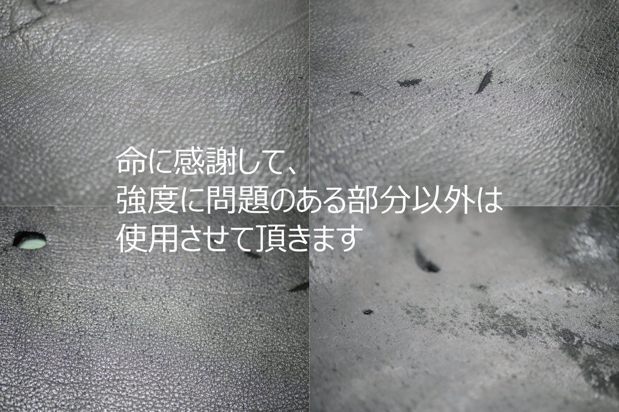 頂いた命を無駄にせず、強度に問題のある部分以外は使用していますので、バラキズ、トラ、血筋、毛穴、銀面のはがれ、色ムラ等があります。