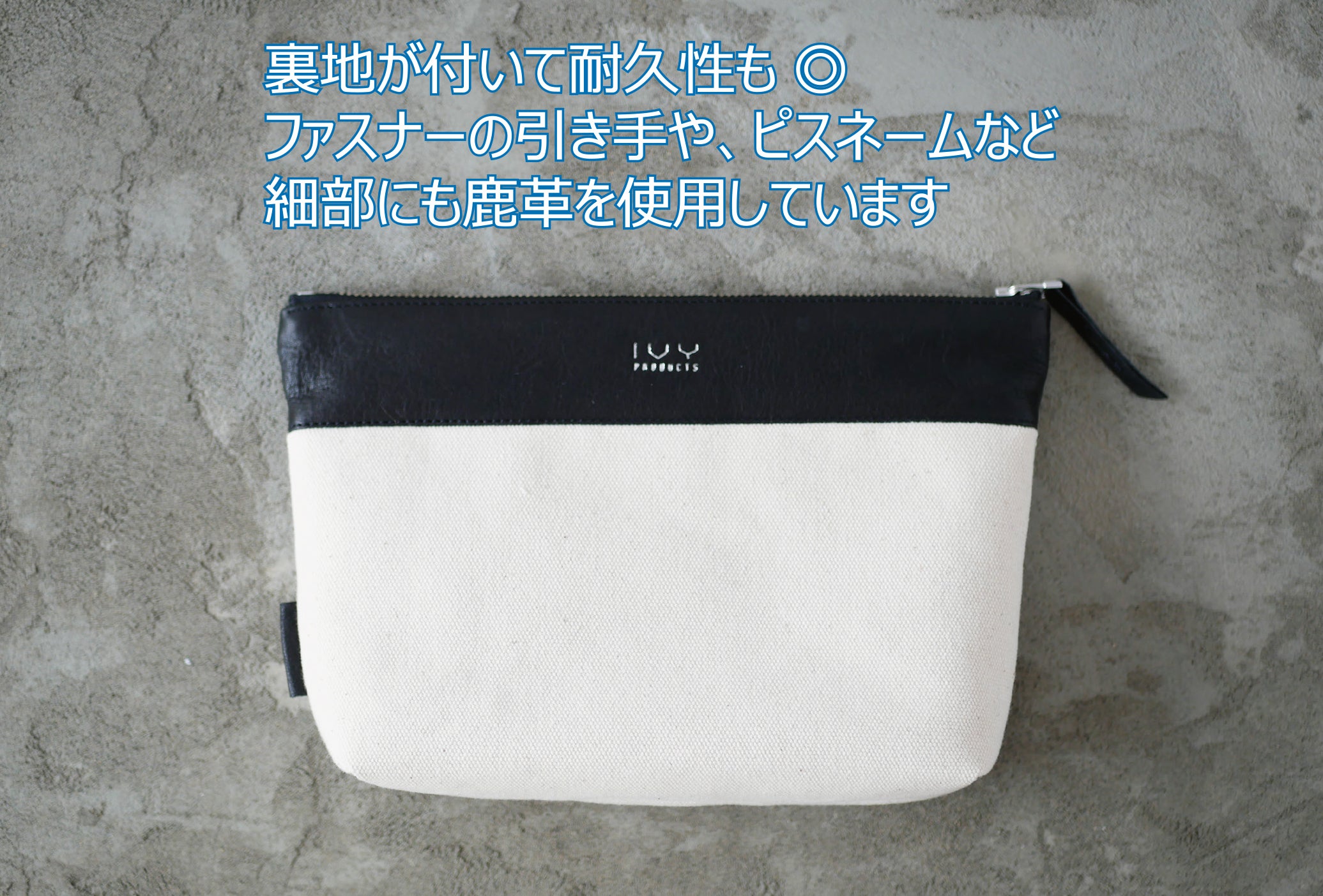 IVY PRODUCTSさんで人気の【 トコポーチ 】の型を使用させて頂いた、鹿革とコットンキャンバスのポーチ。IVY PRODUCTS と lnswirl のロゴが入った、特別限定商品です。