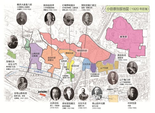 小田原には伊藤博文や山縣有朋、候爵黒田長成、閑院宮、陸軍大将大島義昌、海軍大将瓜生外吉、子爵榎本武揚、長谷川如是閑、三井物産の大番頭益田孝(鈍翁)、男爵大倉喜八郎、松永耳庵らの別邸や邸宅がありました。