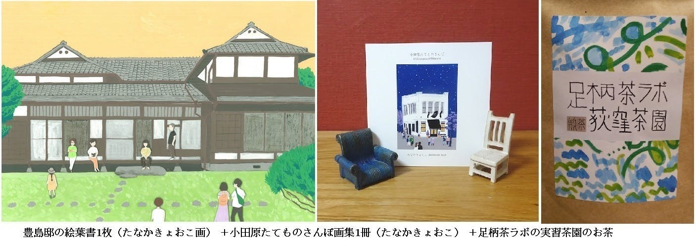 豊島邸の絵葉書1枚(たなかきょおこ画) +小田原たてものさんぽ画集1冊(たなかきょおこ) +足柄茶ラボの実習茶園のお茶(2袋)