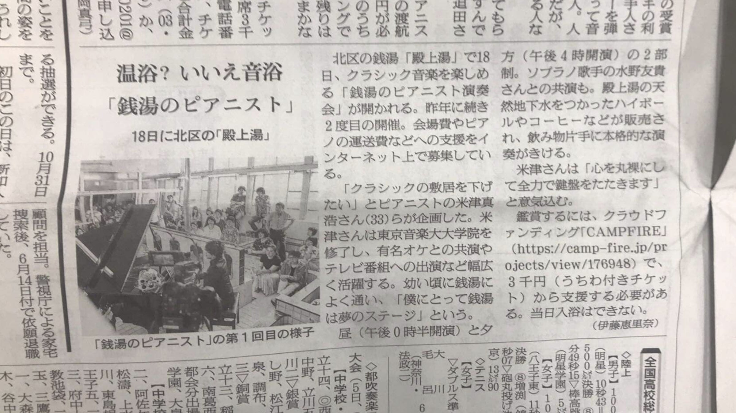 とても嬉しいことに、「銭湯のピアニスト」の記事が、8/6の朝日新聞に掲載されました。記事はこちらかでも読めます。https://www.asahi.com/articles/CMTW1908061300001.html募集締切が、残り10日を切りました。引き続き、身の回りの方への告知のご協力をどうぞよろしくお願いいたします!!