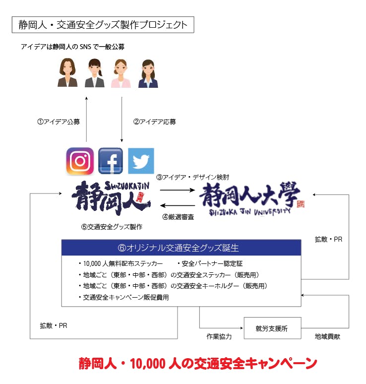 交通安全を祈念したオリジナルステッカーを無料配布し、10,000人が手を取り合い、静岡人ならではの、のんびりとした、ほっこりとした、誰からも愛される交通安全グッズを誕生させ、静岡人みなで交通安全を啓蒙できたら嬉しいです!