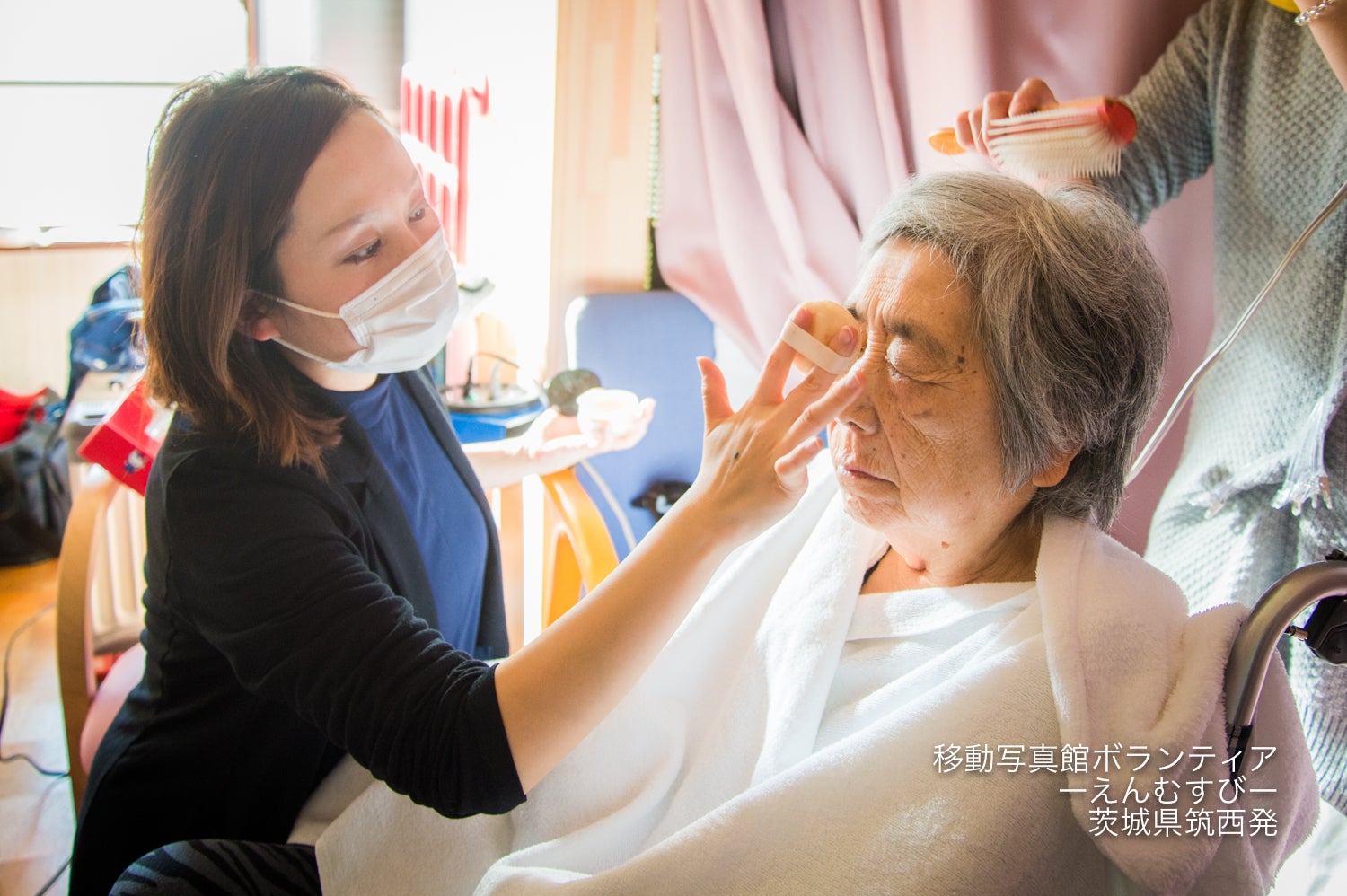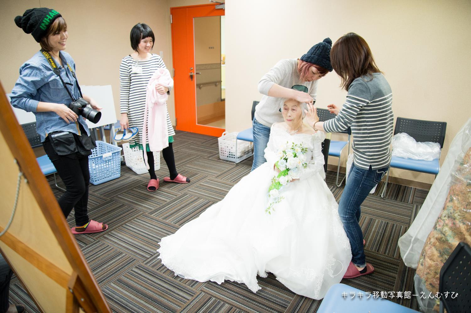 フォトスタジオを始めたことで私の思いに賛同してくれるスタッフと出会い、そして同じ市内で活動をする美容師さんやエステサロンさん、思いに賛同してくださる主婦の方や私の友人など多くの方とボランティアチーム「えんむずび」として活動を続けてきました。活動内容としましては、デイサービスの施設から依頼を受ければ出向き、ヘアメイクをしてさしあげドレスに着替えて撮影をするというスタイルです。