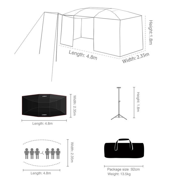 また、キャンプ用テントとして使うときは最大6人が寝転がれるサイズ。