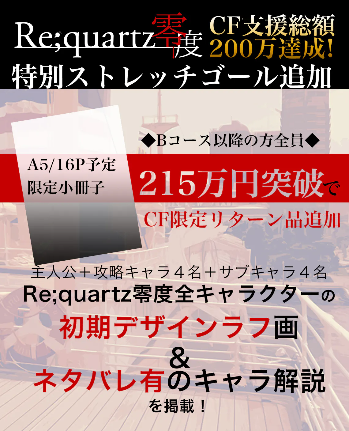 総額215万円を達成すると、<全キャラの【初期デザインラフ画&物語のネタバレを含んだ解説】掲載小冊子(A5/モノクロ16p)>を、クラウドファンディング限定リターン品として新たに制作!