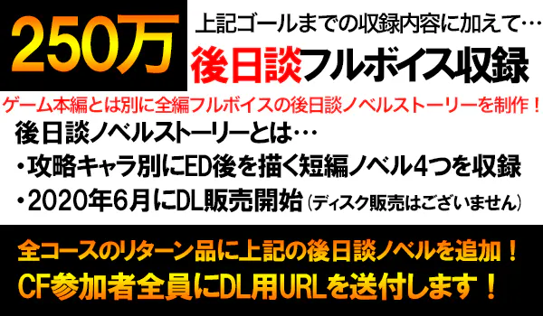 支援総額250万円を達成すると、ゲーム本編とは別に、全編フルボイスの後日談ノベルストーリーを制作し、【2020年6月に公開】します!