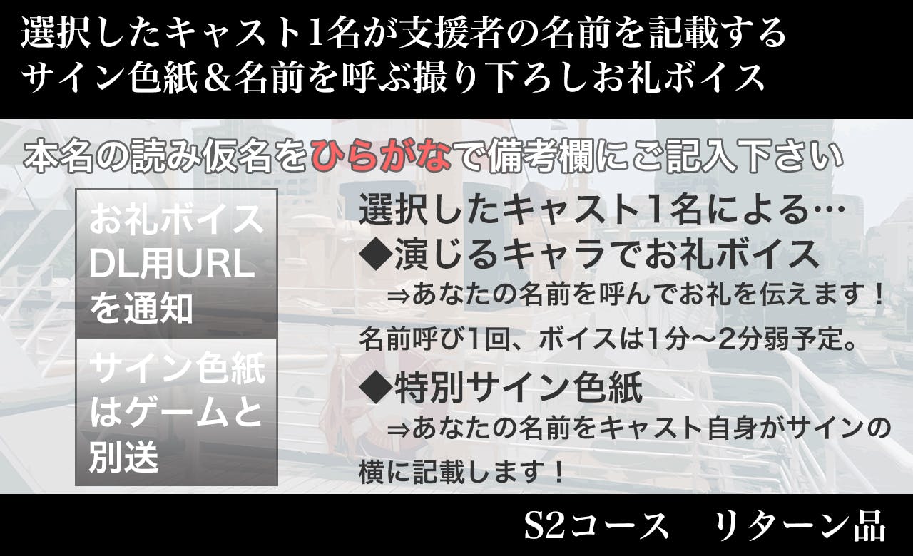 ◆(S2/SS2コースご支援の方)『名前呼びつき録り下ろしお礼ボイス』がリターンに含まれている場合、本名の読み仮名を“ひらがな”で「備考欄」にご記入ください。