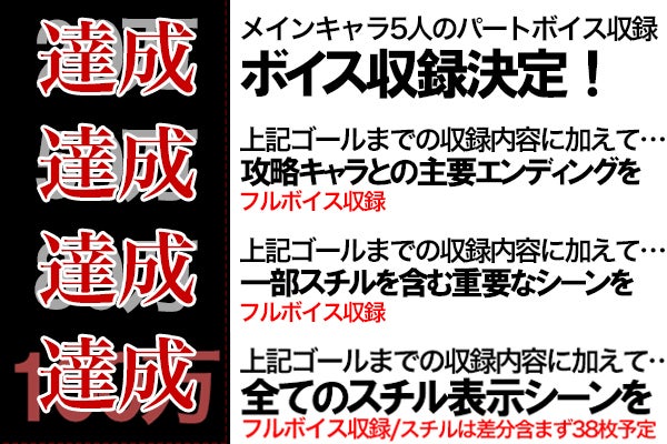 クラウドファンディング開始前から、全てのスチル表示シーンをフルボイスに…というのは、目標のひとつではありましたが、正直、支援開始日当日に達成するとは、全く予想しておりませんでした。