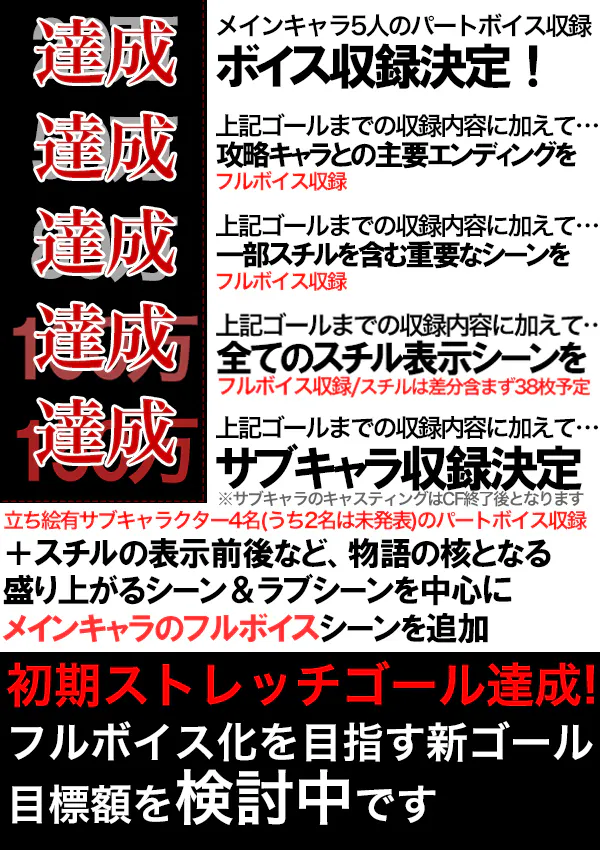とお伝えしたのですが、これ以上収録ボイス数を増やした場合、どの程度の予算が必要になるのか、ひいてはストレッチゴールの目標額がいくらになるのか…という面の精査に、今しばらくお時間を頂いてしまいそうです。