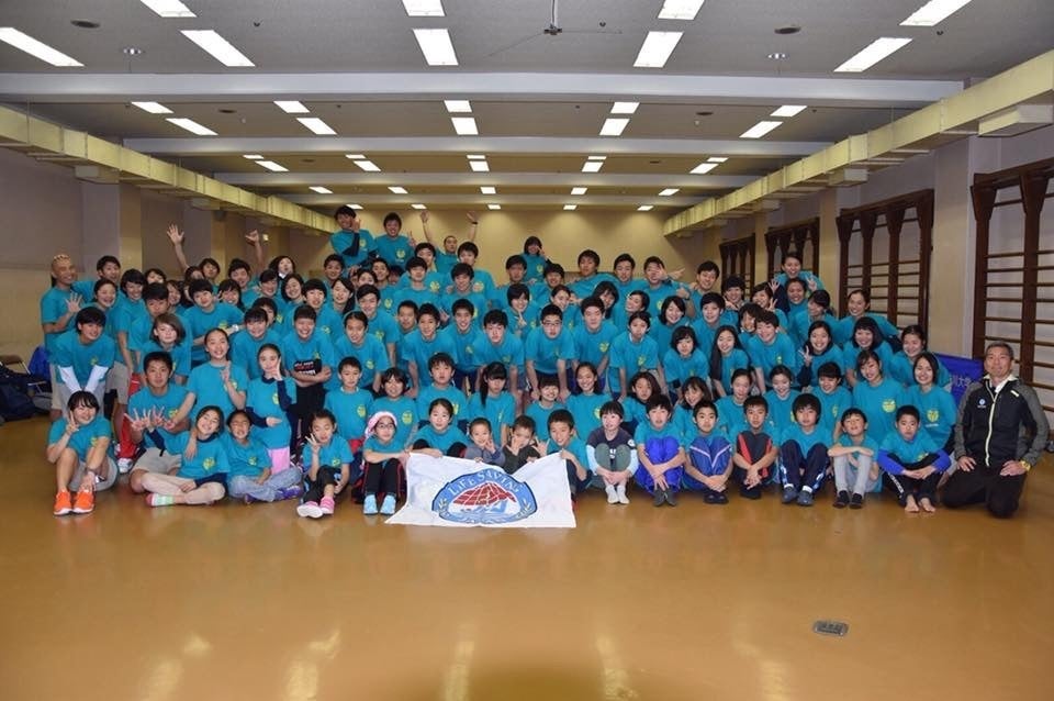 (小学生から対象のライフセービングプログラムで皆さんのTシャツをデザインしました。その際にみんなで着ている写真です)