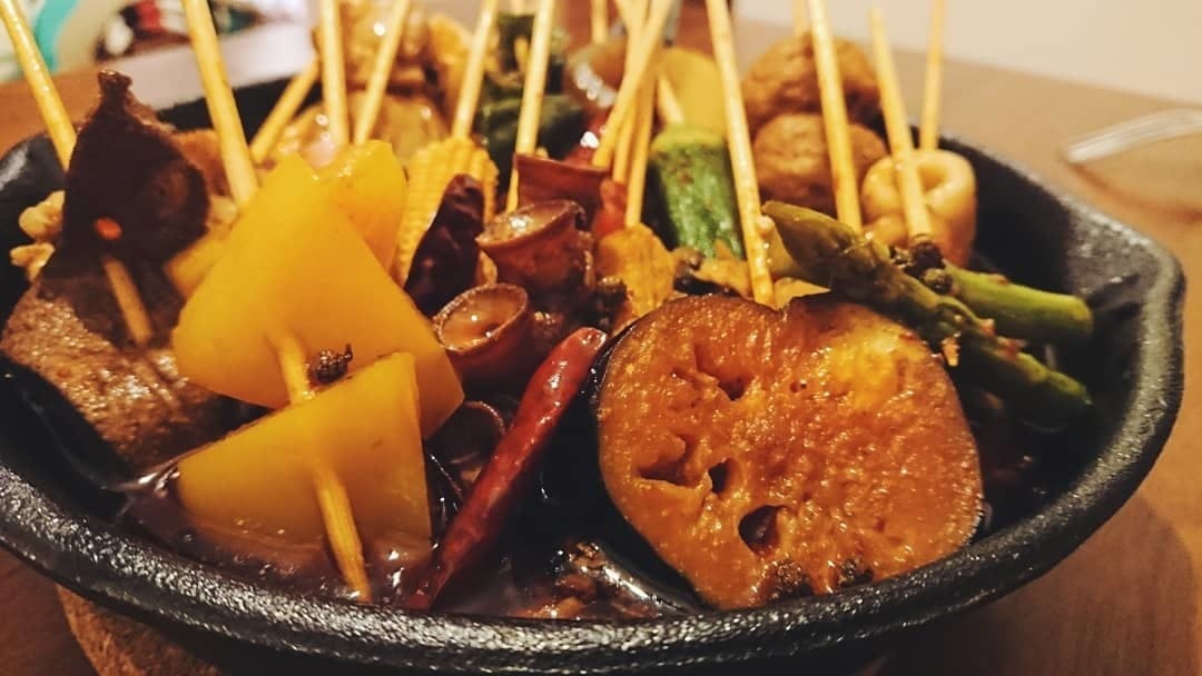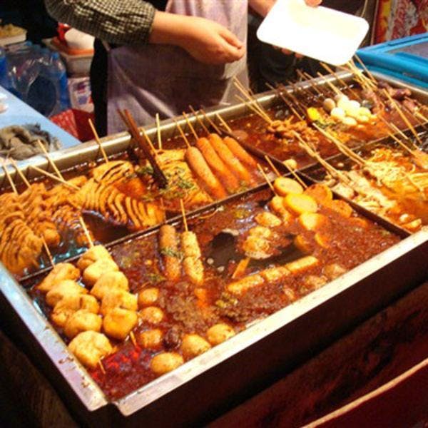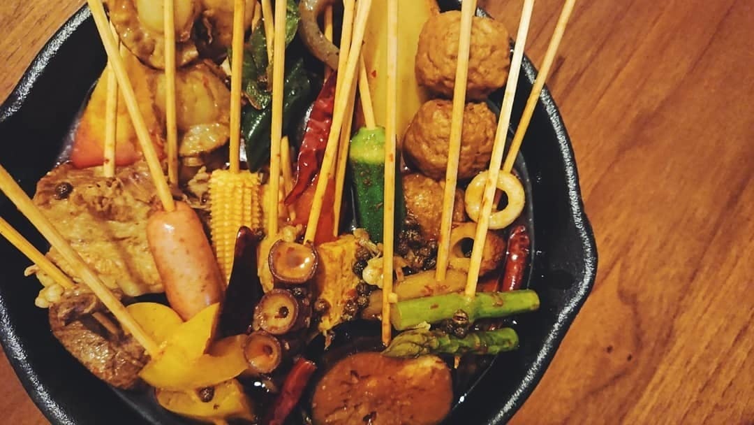 唐辛子や花椒の入った、辛くて痺れるスープで、串に刺した野菜や肉等の食材を煮込んだもので、