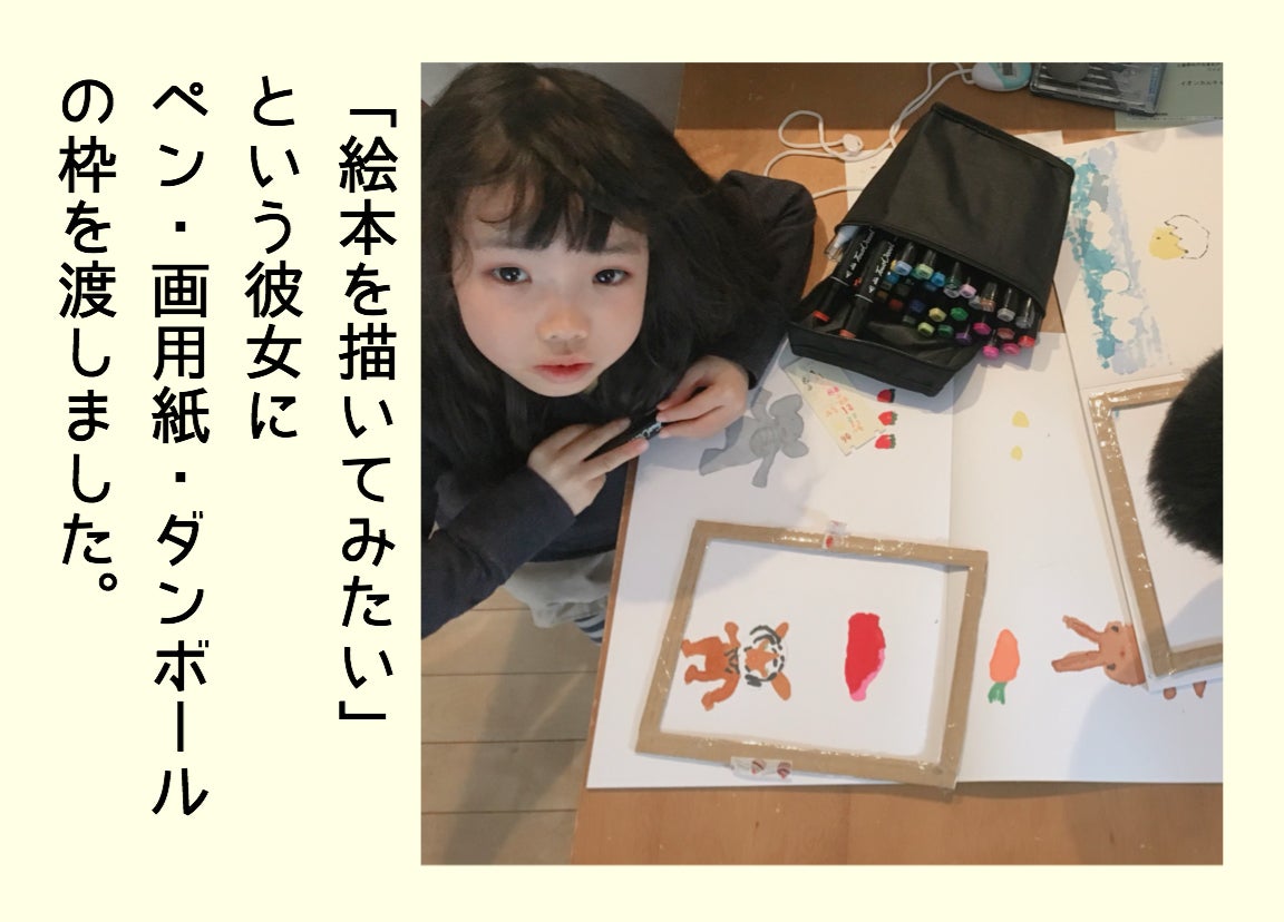 ある日、「絵本を描いてみたい」という彼女に、ペンと画用紙、それから段ボールで作った枠を渡しました。あとは自由。大好きなお兄ちゃんと二人で描き始めた絵本。お兄ちゃんは途中で終わってしまったけれど、こはるは最後まで書き上げました。