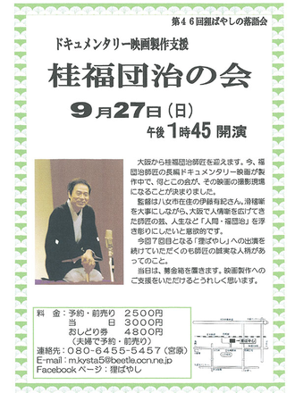 第46回狸ばやしの落語会、桂福団治の会は9月27日(日)午後13時45分開演です。
