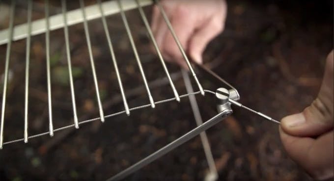 グリル部分の面についている螺旋状の補助パーツがポジションをより固定し、もし薪木や木炭を追加するのに当たったりして衝撃が加わっても、簡単に外れないようになっています。