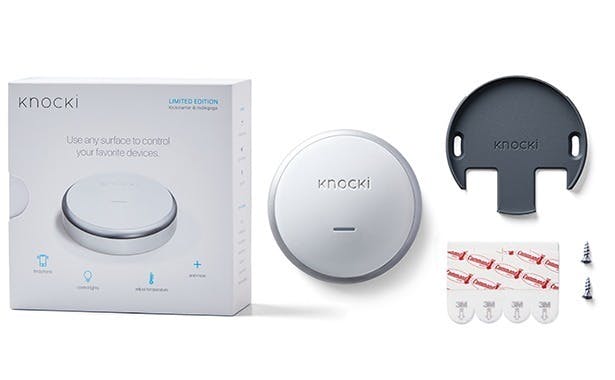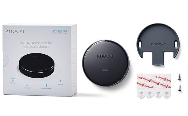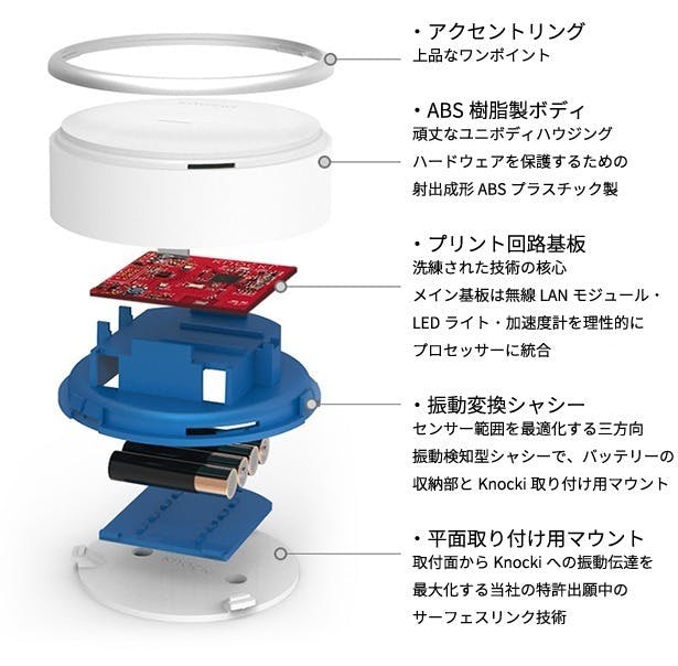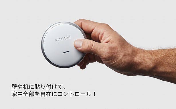 A.Knockiは平面に張り付けて、ノックする事でWi-Fiネットワーク上のIOT機器のコントロールが可能なデバイスです。ノックの回数に応じて事前に登録されたアクションを自動的に実行します。