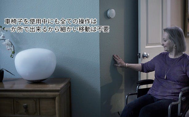 車いすを使用している方には、近くの壁をノックするだけでその場から動き回らずに照明・テレビ・音楽・エアコンなどが全てワンノックで操作可能です。
