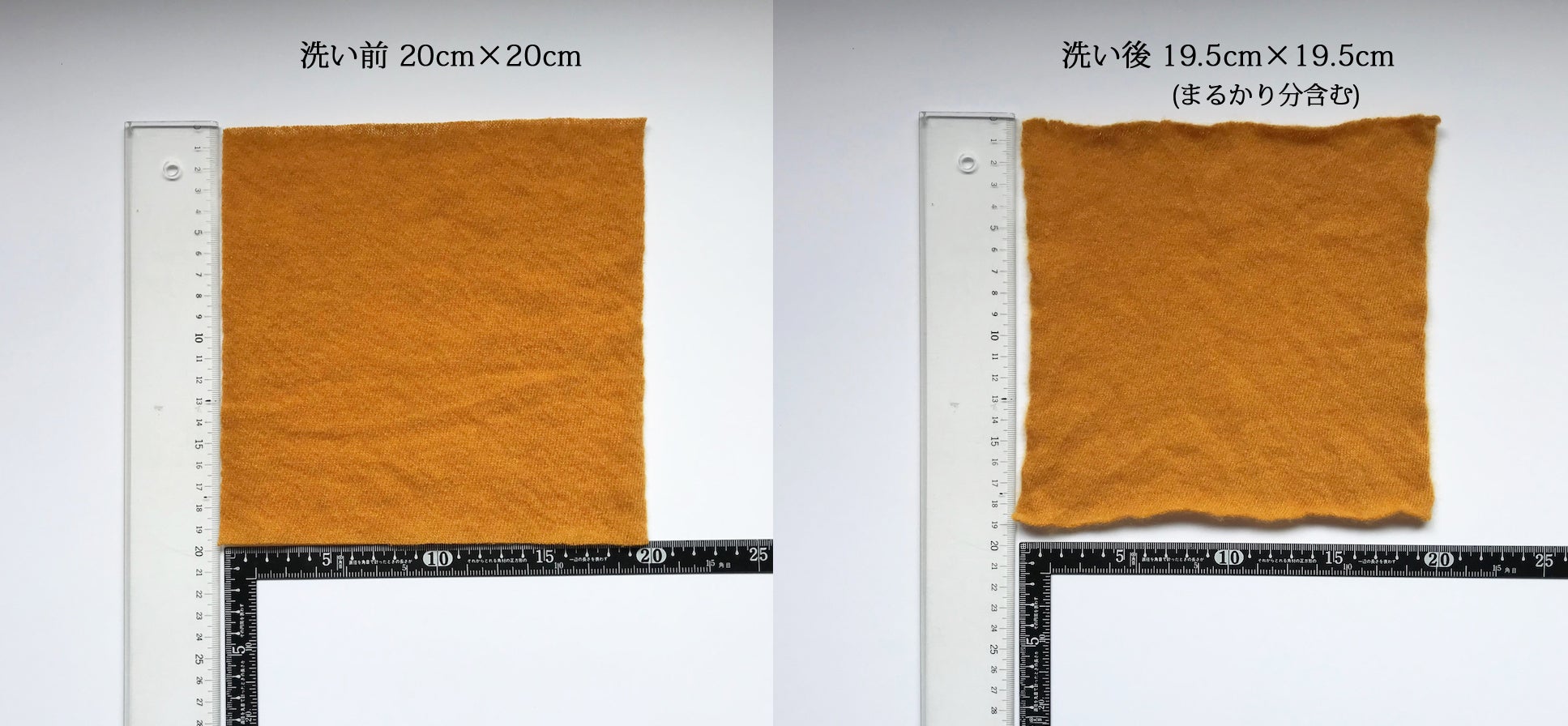 洗濯前:縦20cm×横20cm ⇒ 洗濯後:縦19.5cm×横19.5cm(まるかり部分含む)