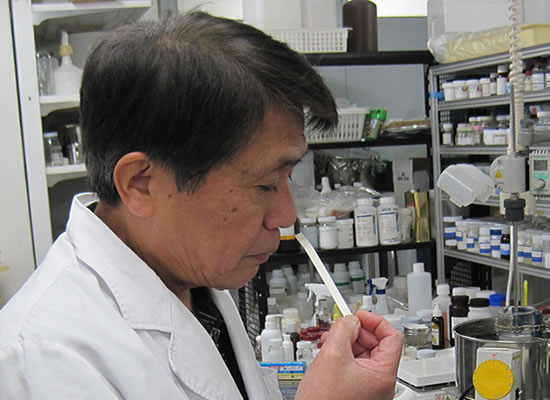 燃えなくて、きれいな空気で身体にも影響がないアロマオイルの製造を最優先に。まずは香料を。調香師さんに香料をお願い。