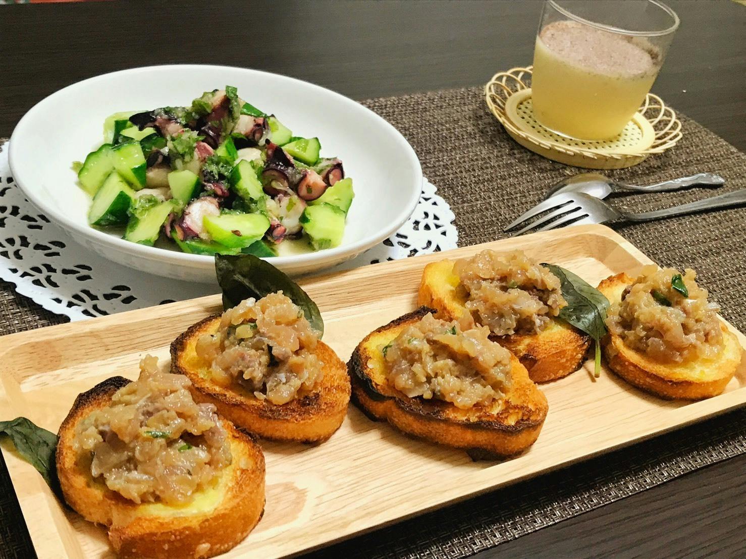 ・アジのブルスケッタ&たこと胡瓜の大葉ジェノベーゼ&ティラミス