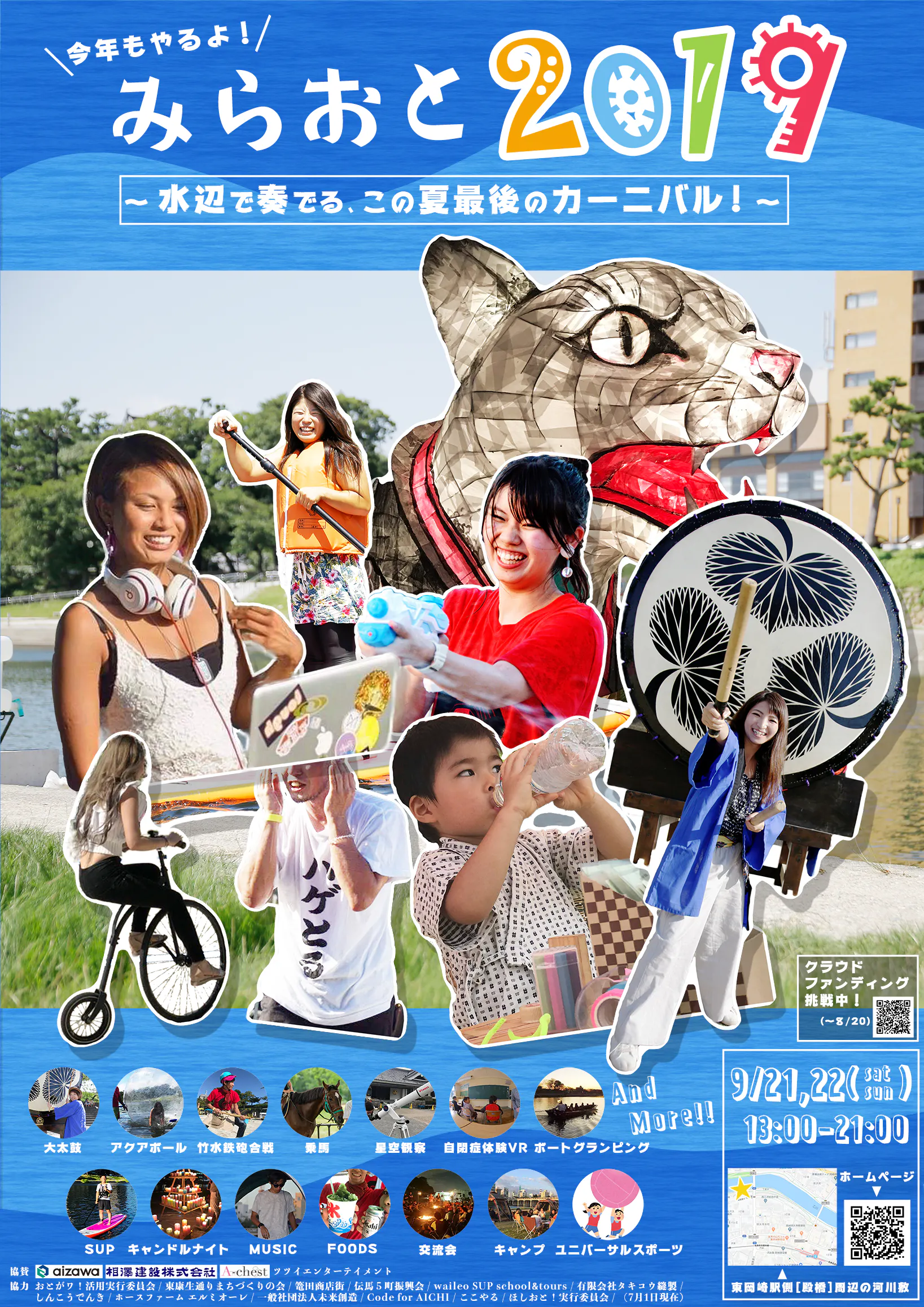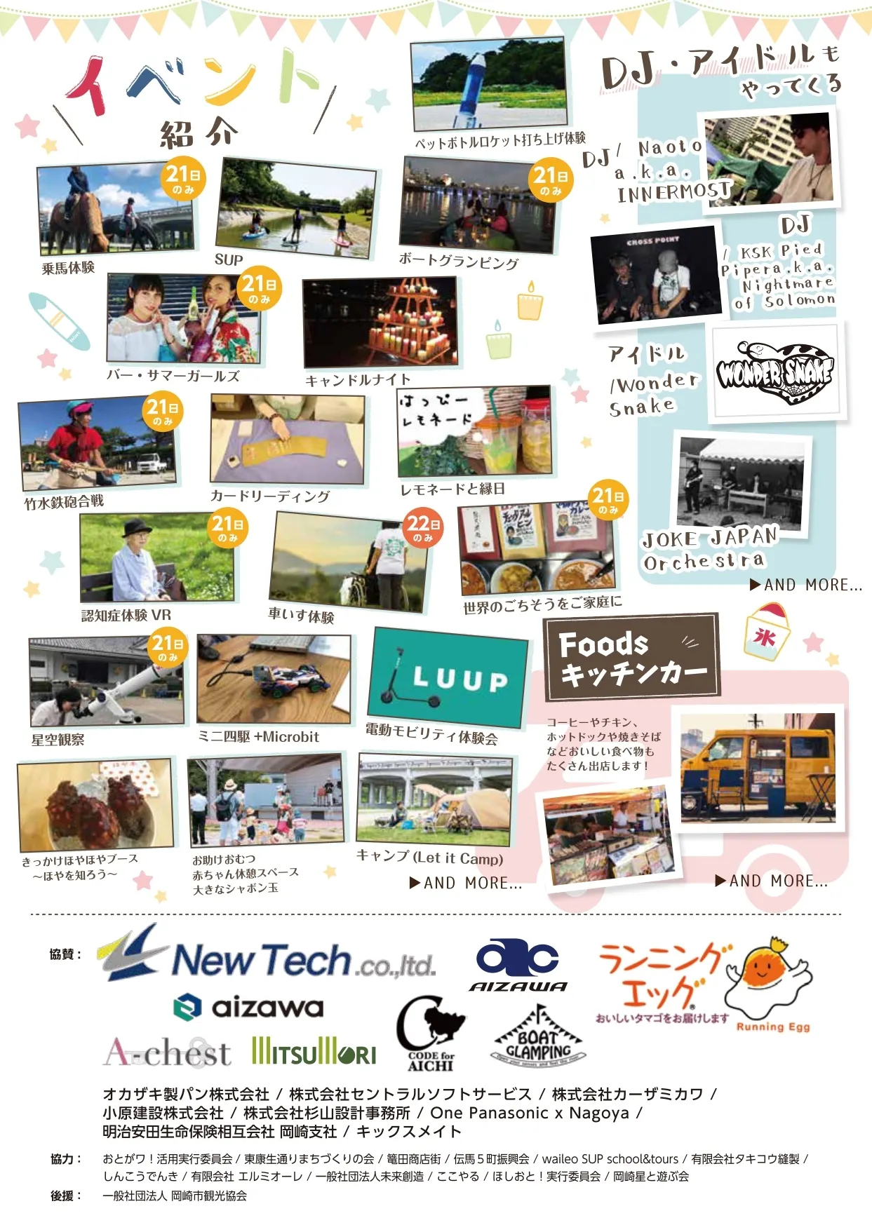 岡崎市の中心部を流れる乙川河川敷を会場として、音楽ライブや川を楽しむSUP(スタンドアップパドルボード )、ウォーターボート体験、竹水鉄砲、乗馬体験などのアクティビティやマルシェなどの非日常体験を楽しめる空間です。